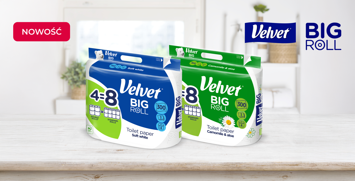 4 rolki Velvet BIG ROLL zastępują 8 standardowych, oferując dłuższe użytkowanie, więcej przestrzeni i wyjątkowy komfort na co dzień.