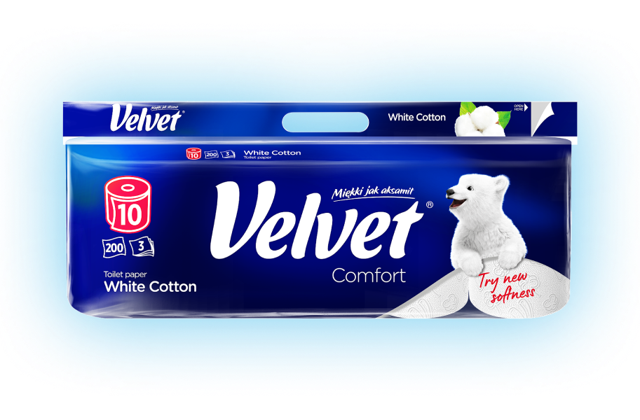 Velvet COMFORT White Cotton to prawdziwy bohater Twojej codzienności w 10 rolkach. Miękki jak bawełna i niezawodny w każdej sytuacji. Zawsze dzielny i gotowy, by dzięki 200 listkom zapewniać komfort, który trwa niezwykle długo.