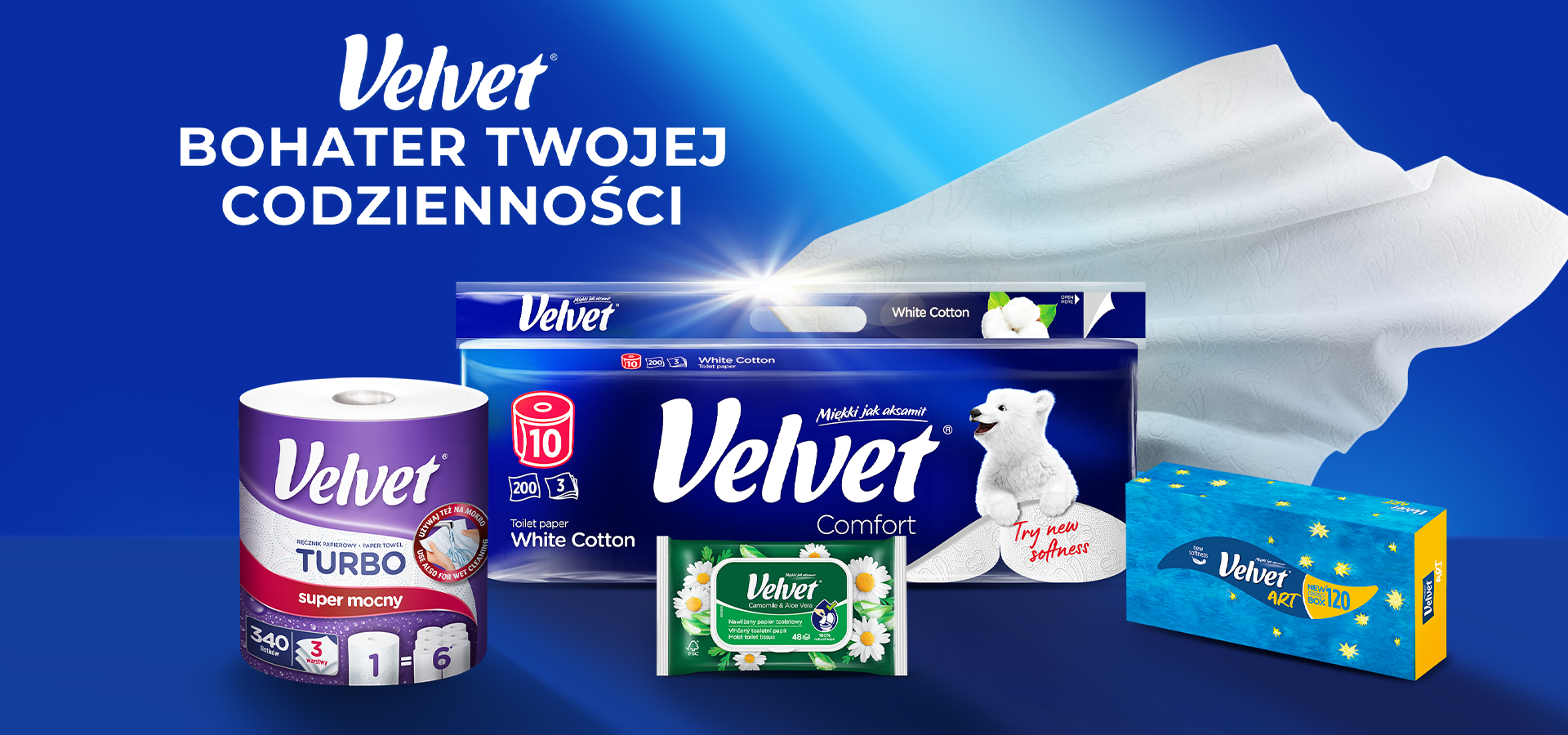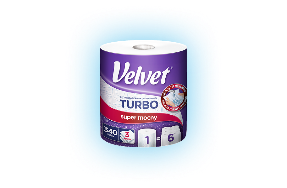 Nie trzeba peleryny, żeby ratować sytuację – wystarczy Velvet Turbo w giga rolce. Niezwykle chłonny, mocny i wytrzymały ręcznik papierowy, który szybko i skutecznie usuwa zabrudzenia. Działa równie dobrze na sucho, jak i na mokro. Velvet Turbo – sprzymierzeniec w codziennych porządkach.