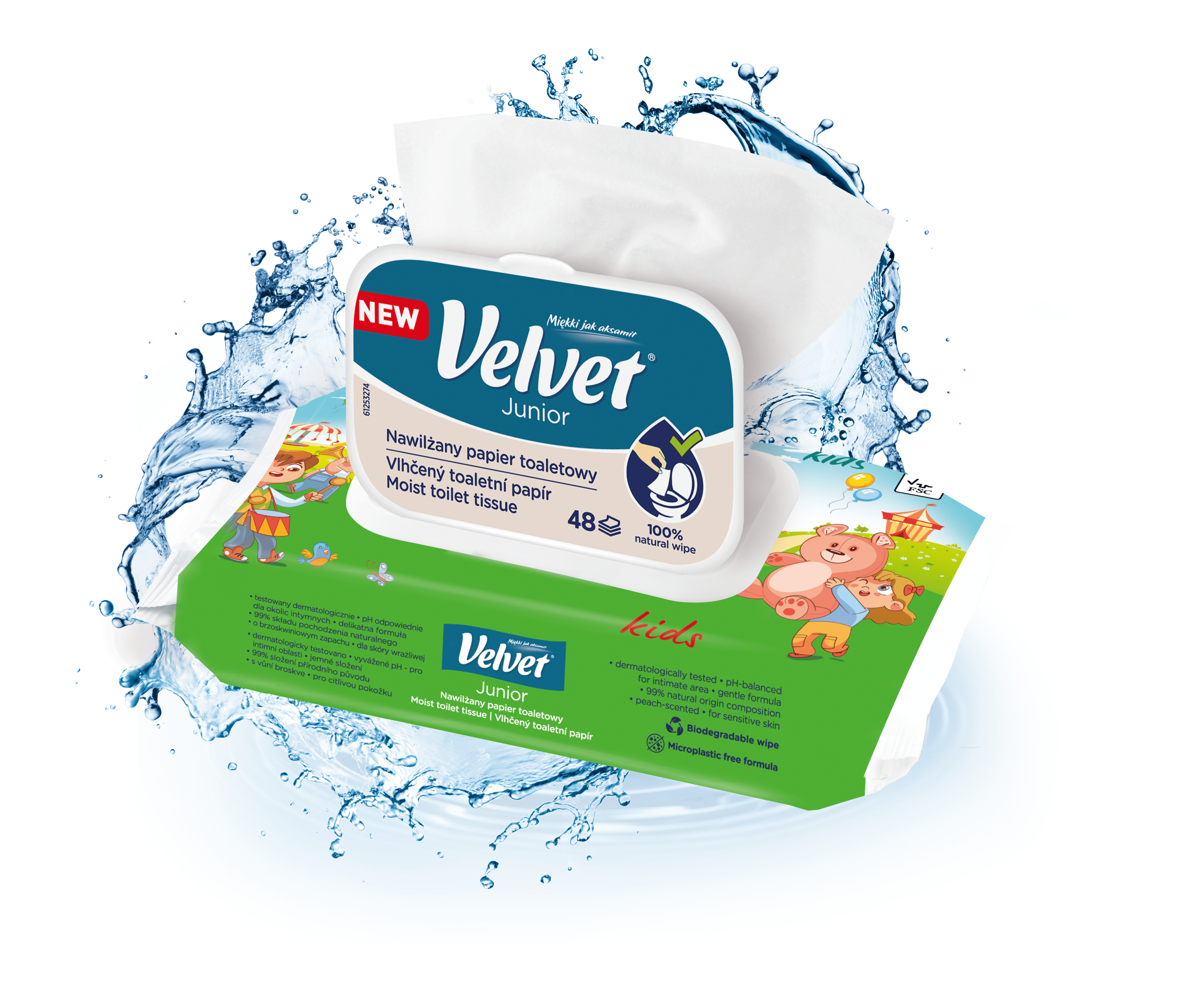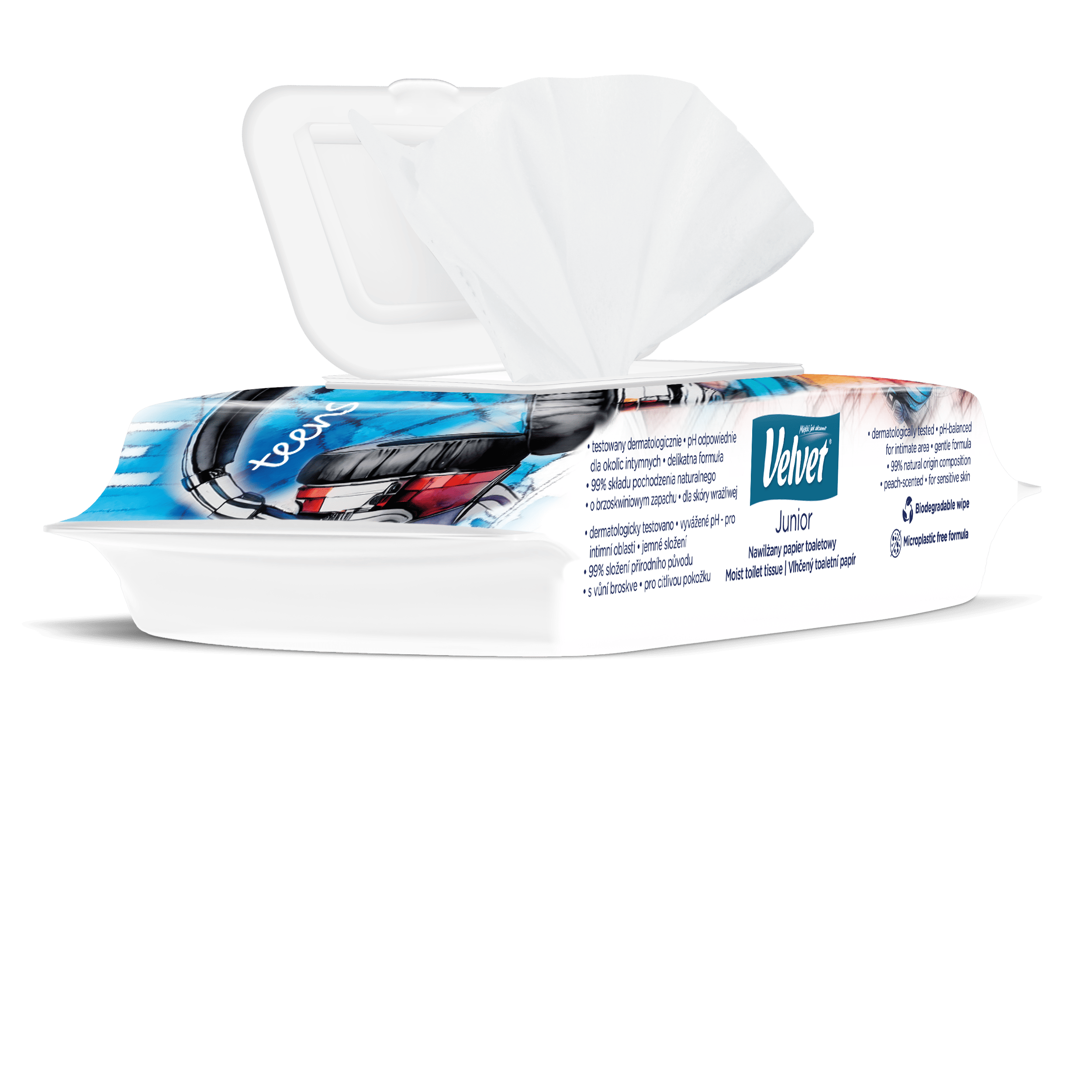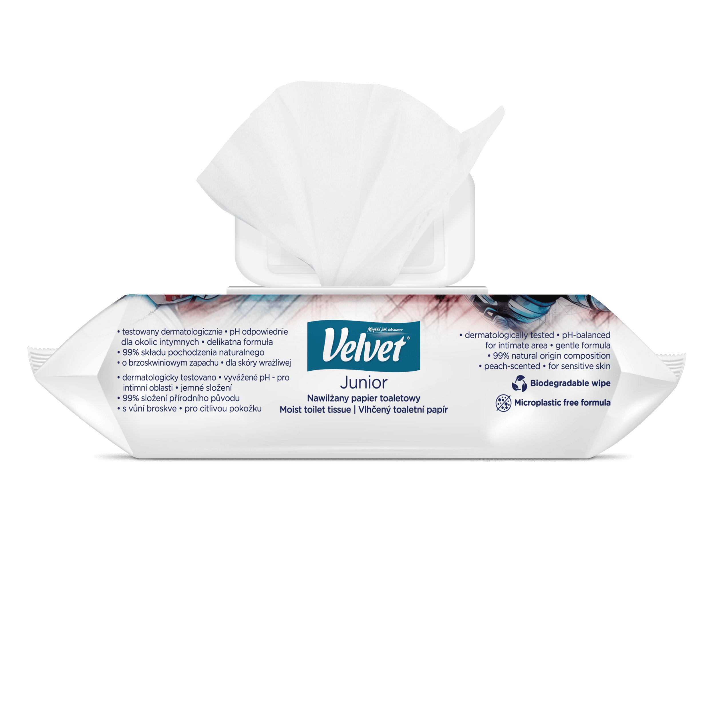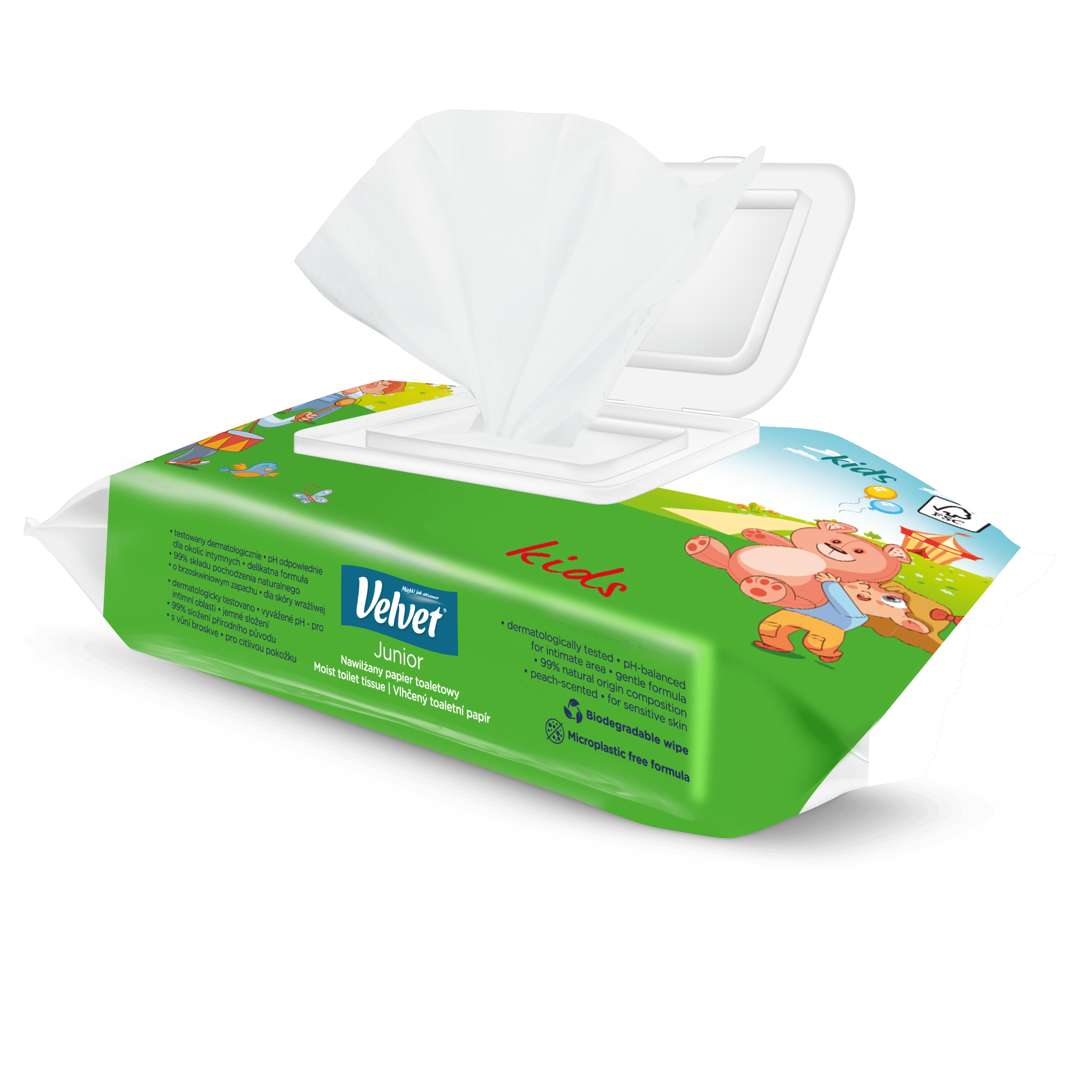 Vlhčený toaletní papír Velvet Junior nabízí kombinaci dvou grafických designů – jeden je určen pro mladší, předškolní děti, které teprve začínají svou cestu k samostatnosti na toaletě, a druhý je navržen s ohledem na starší děti, které si jej rády přibalí do školního batohu a vezmou s sebou. Produkt je dermatologicky testován a má ovocnou vůni.