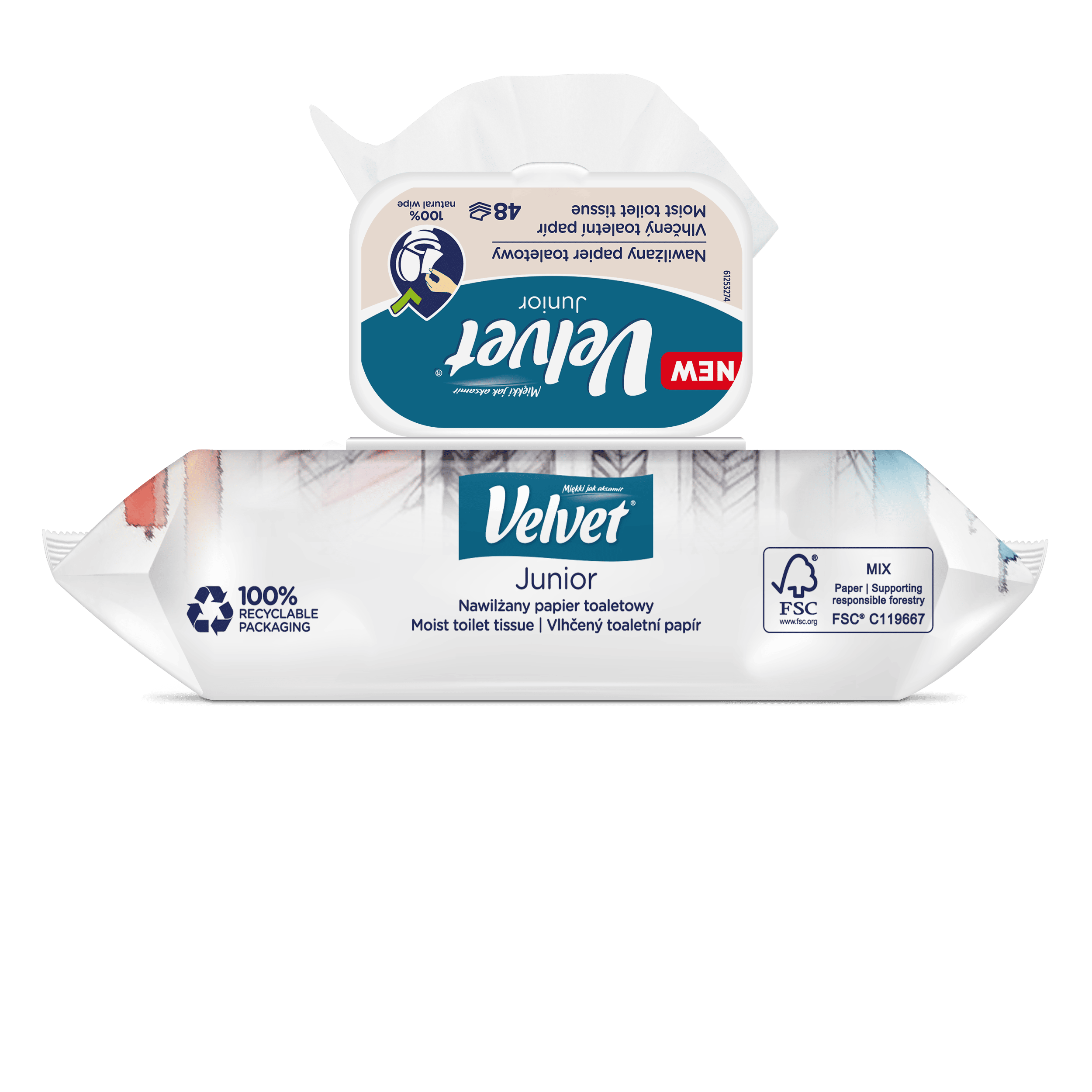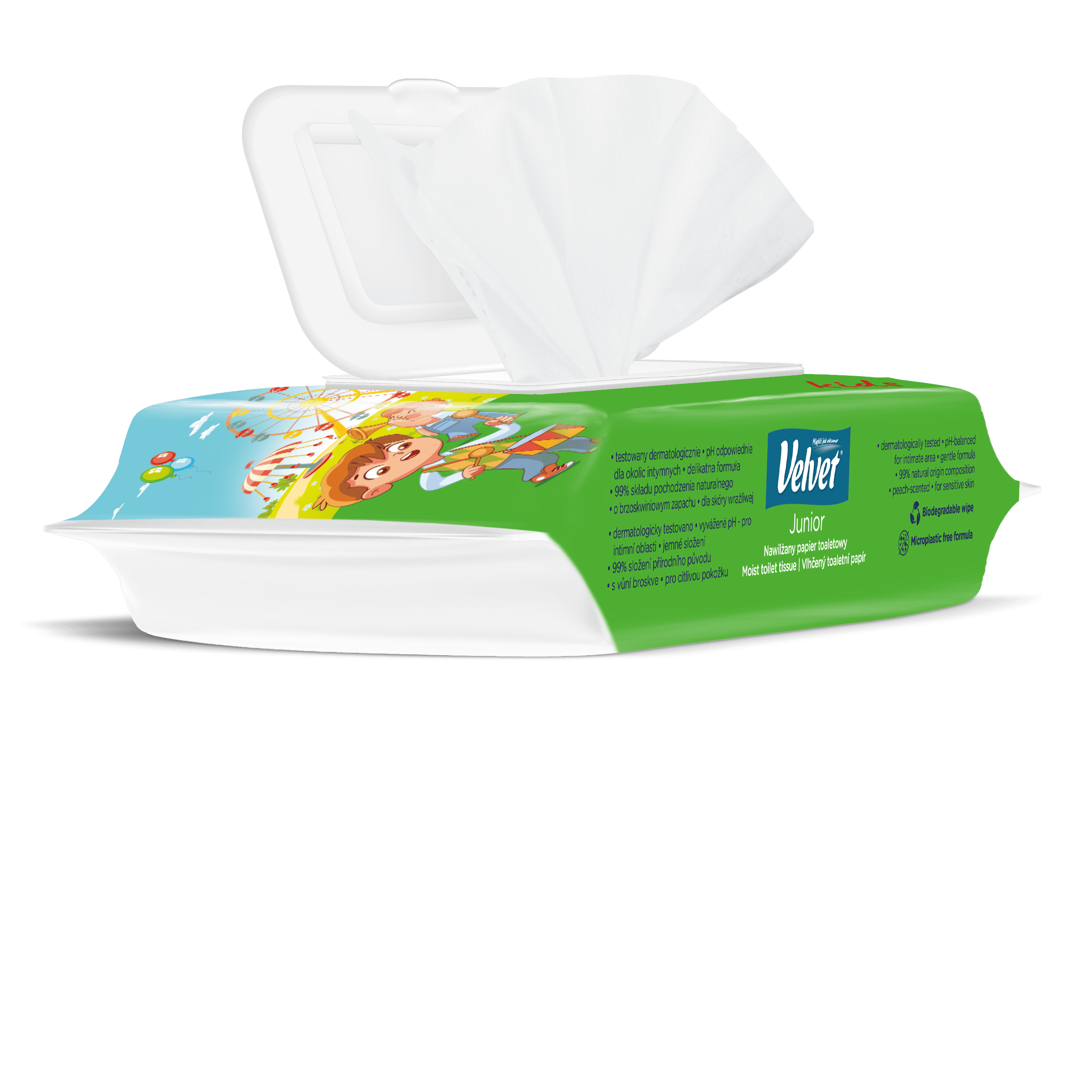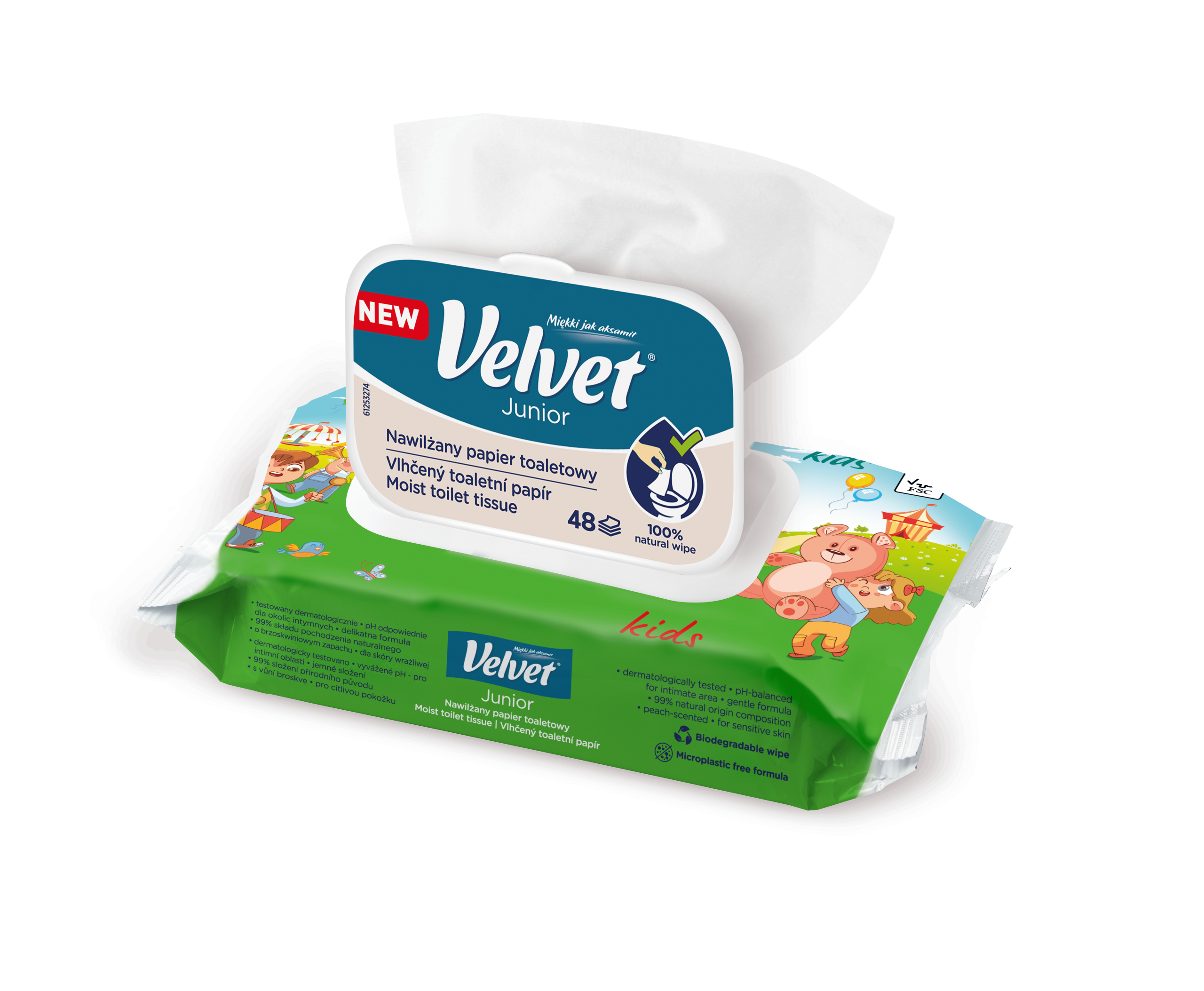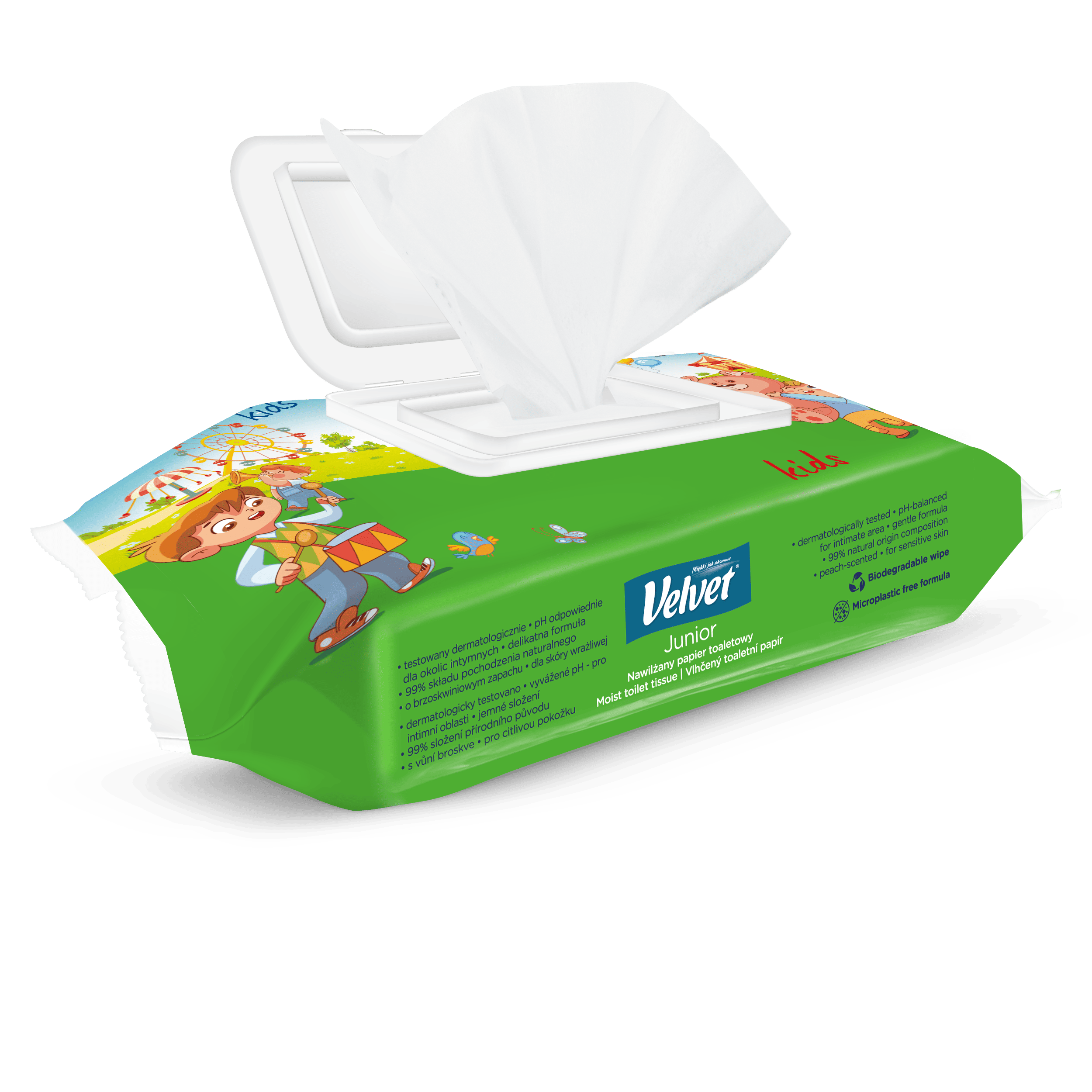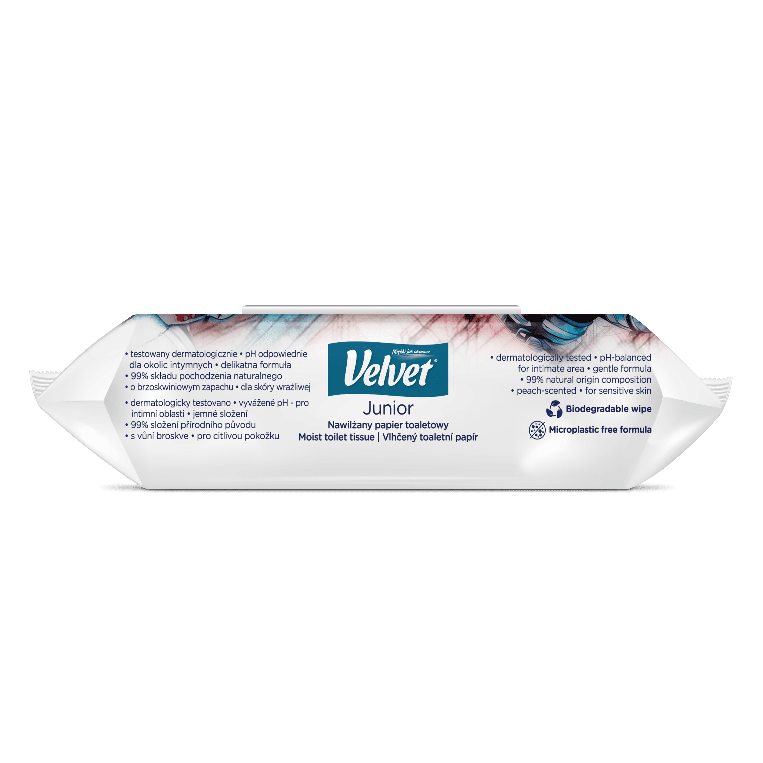 Vlhčený toaletní papír Velvet Junior nabízí kombinaci dvou grafických designů – jeden je určen pro mladší, předškolní děti, které teprve začínají svou cestu k samostatnosti na toaletě, a druhý je navržen s ohledem na starší děti, které si jej rády přibalí do školního batohu a vezmou s sebou. Produkt je dermatologicky testován a má ovocnou vůni.