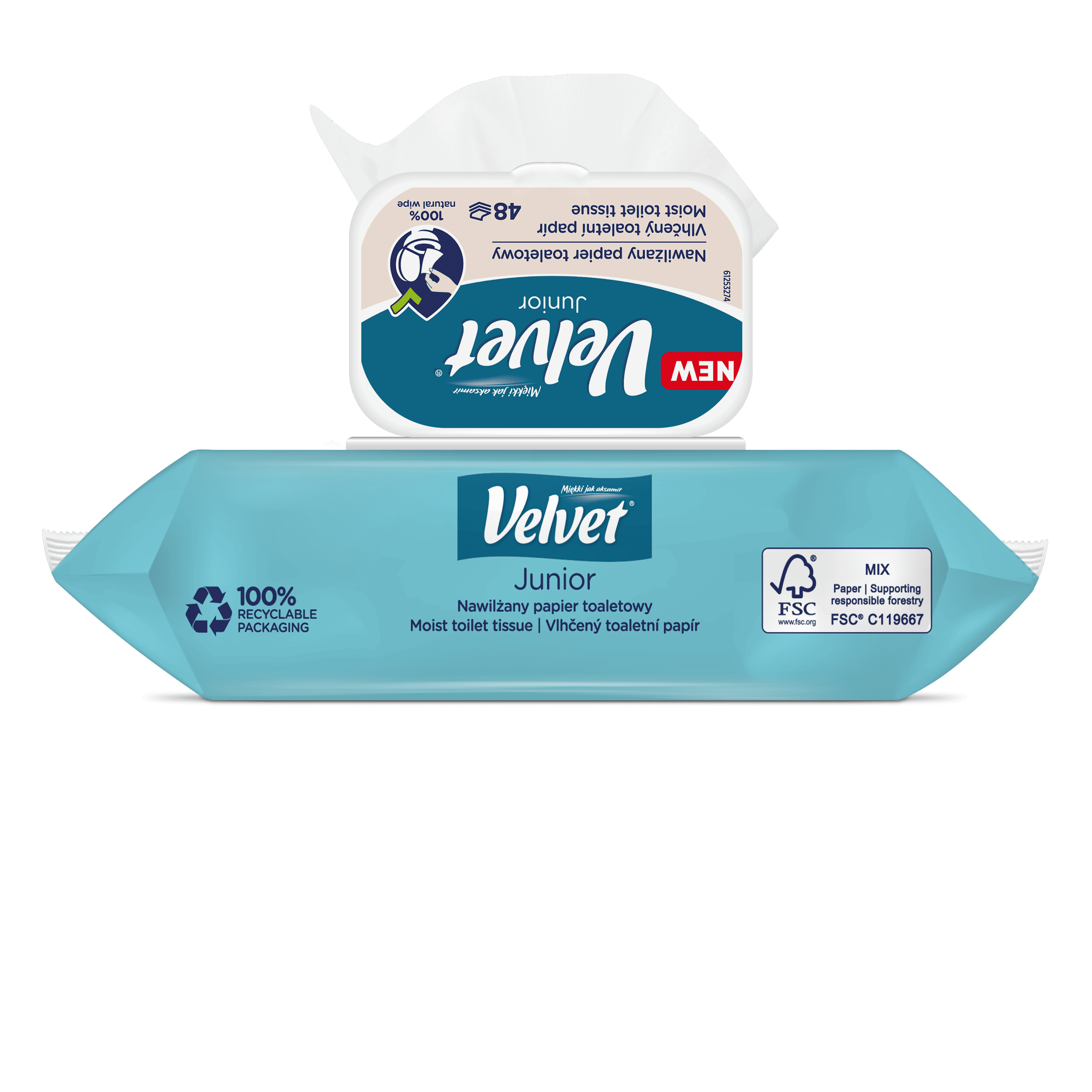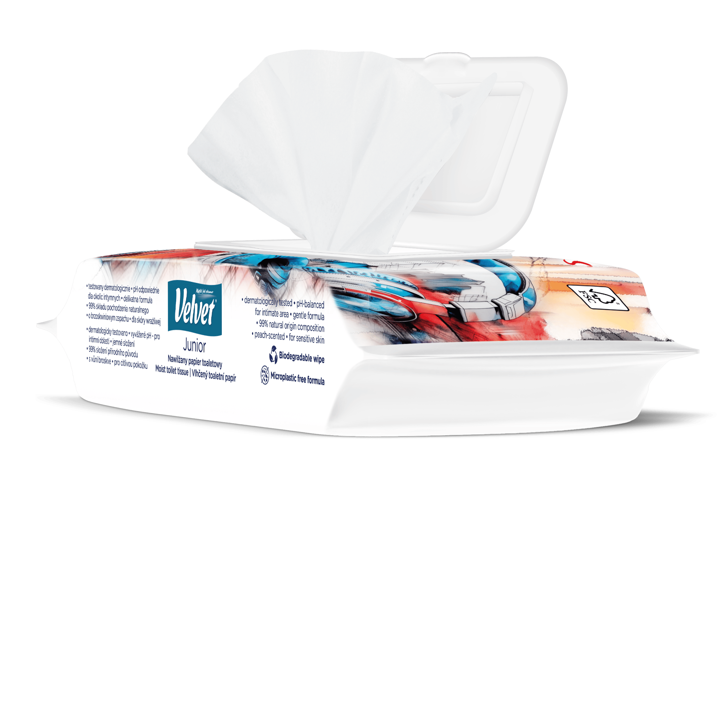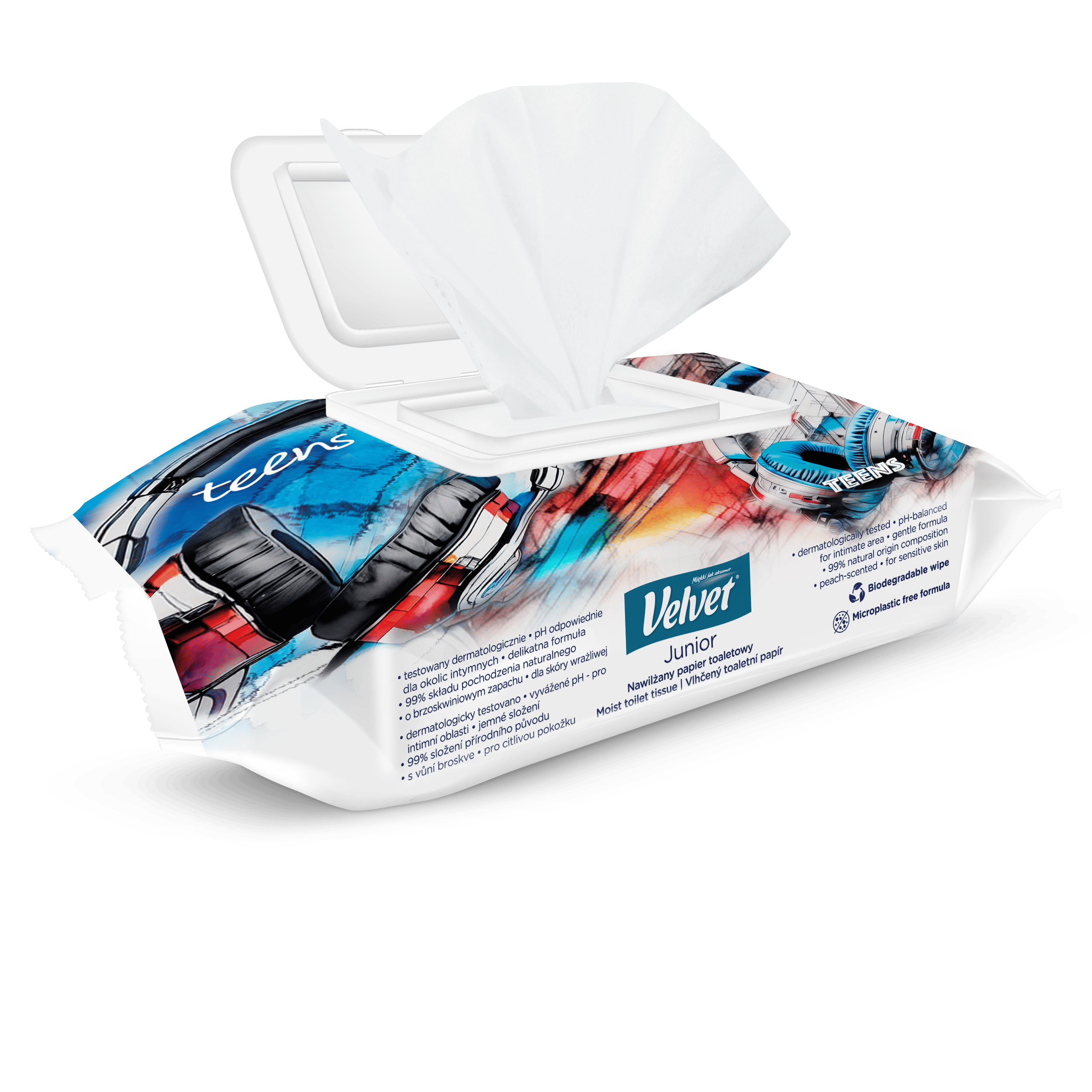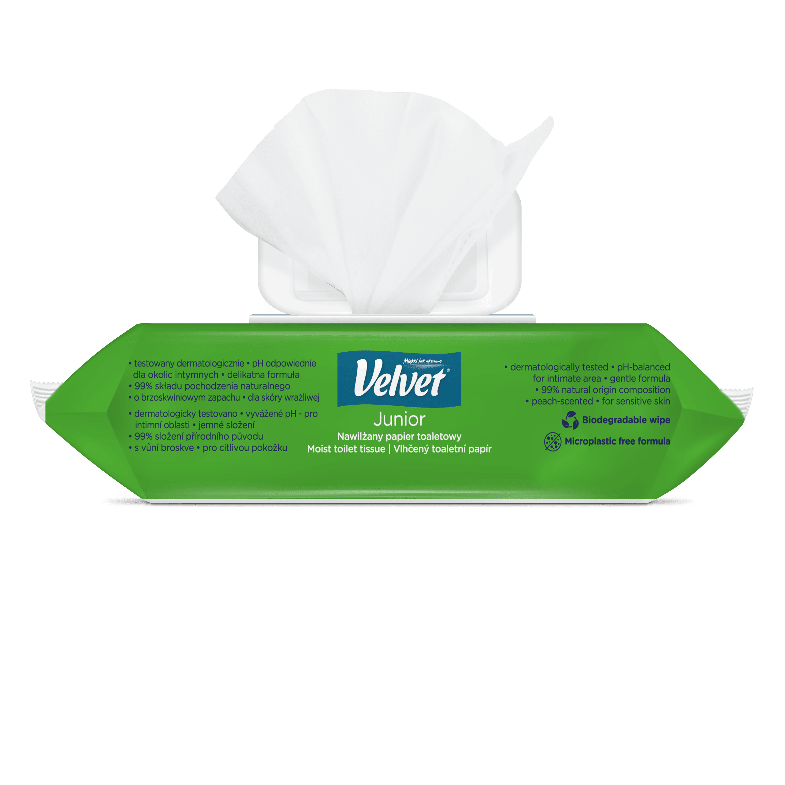 Vlhčený toaletní papír Velvet Junior nabízí kombinaci dvou grafických designů – jeden je určen pro mladší, předškolní děti, které teprve začínají svou cestu k samostatnosti na toaletě, a druhý je navržen s ohledem na starší děti, které si jej rády přibalí do školního batohu a vezmou s sebou. Produkt je dermatologicky testován a má ovocnou vůni.