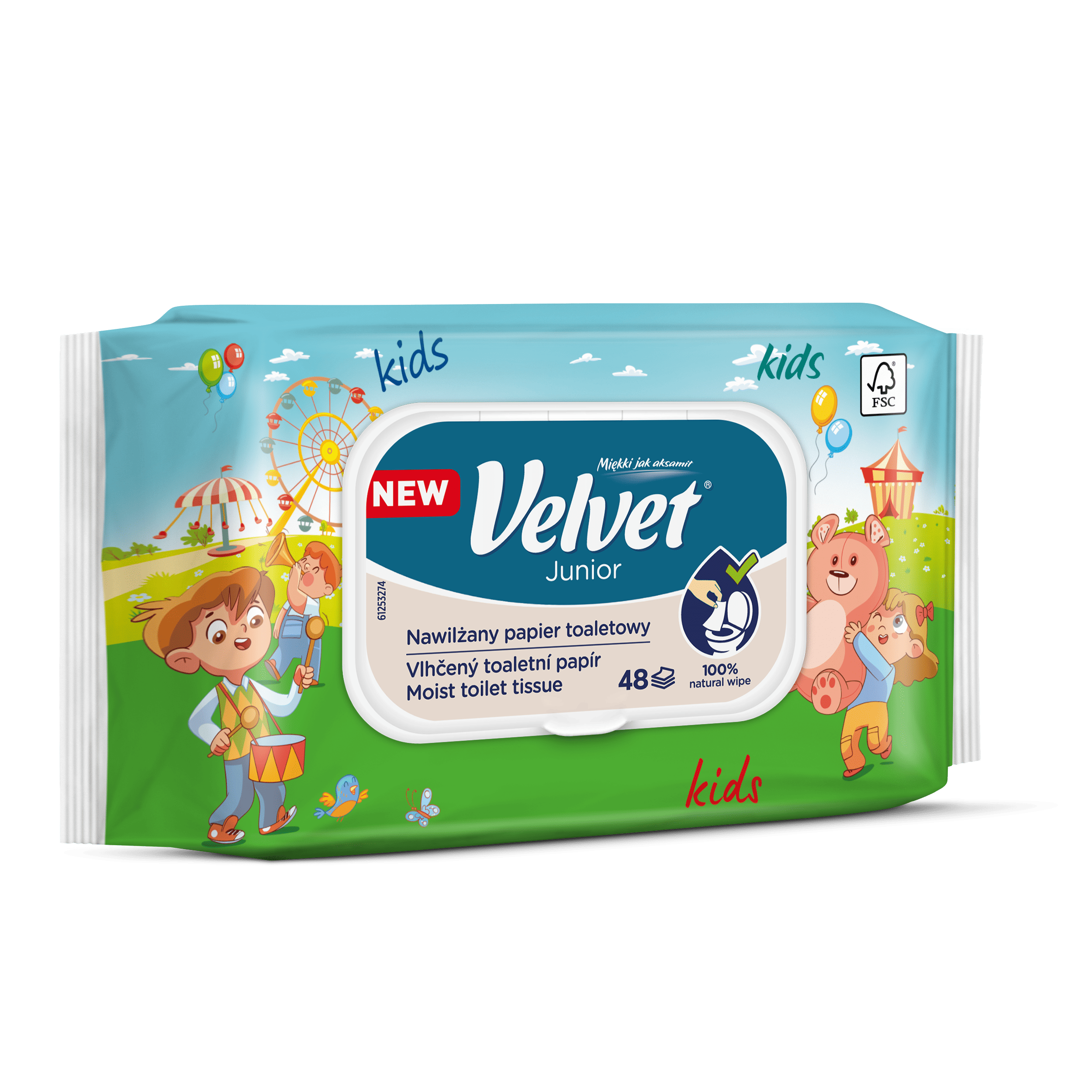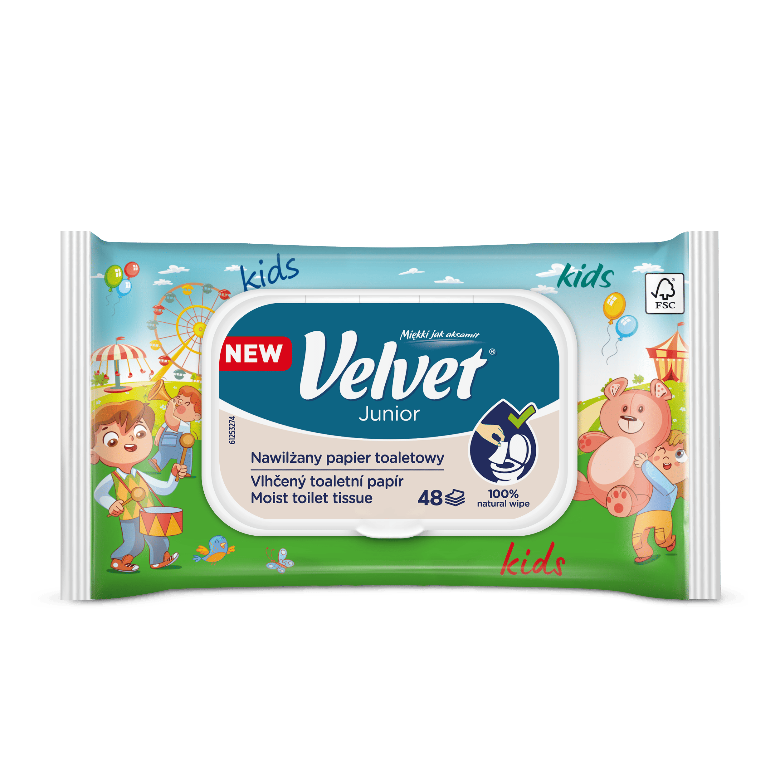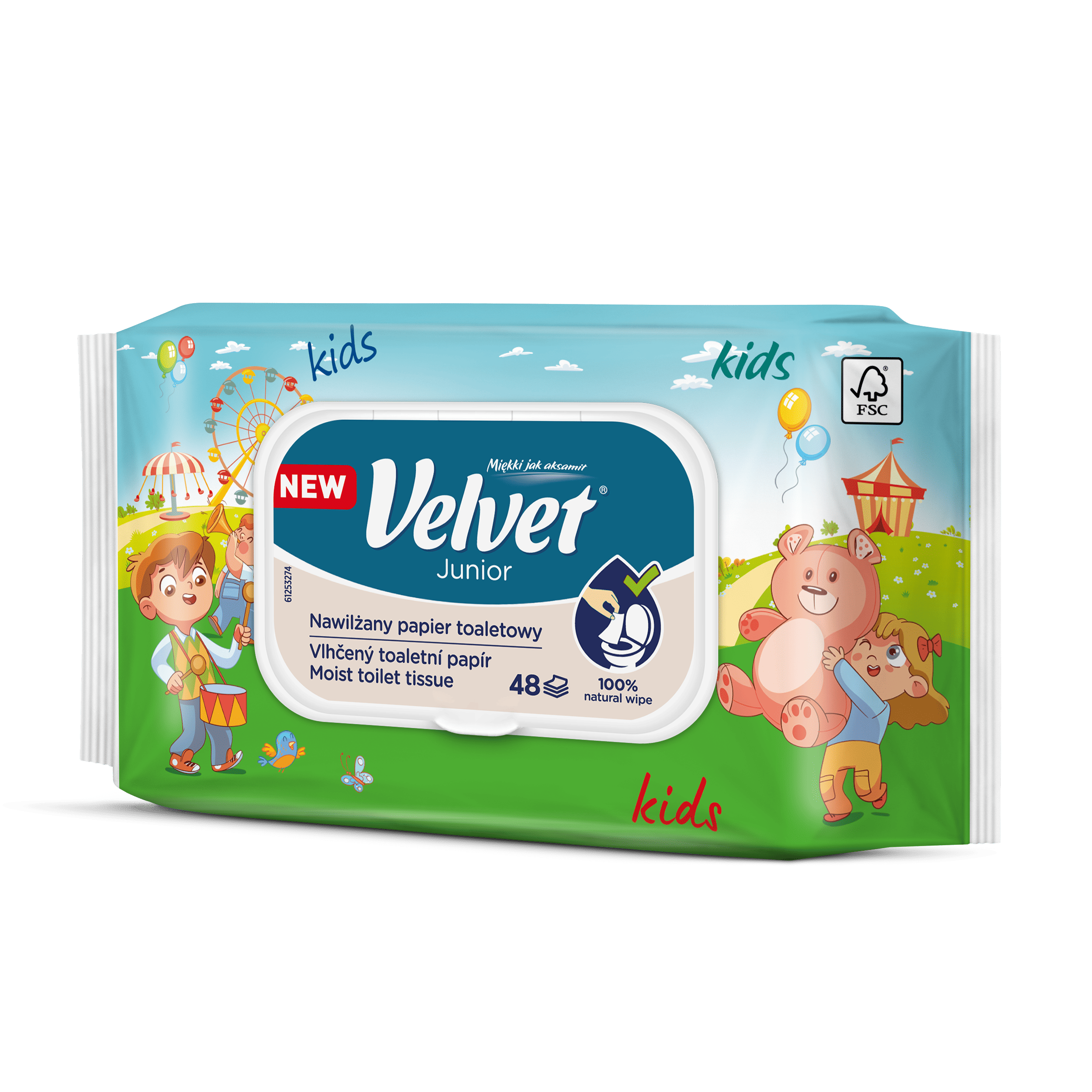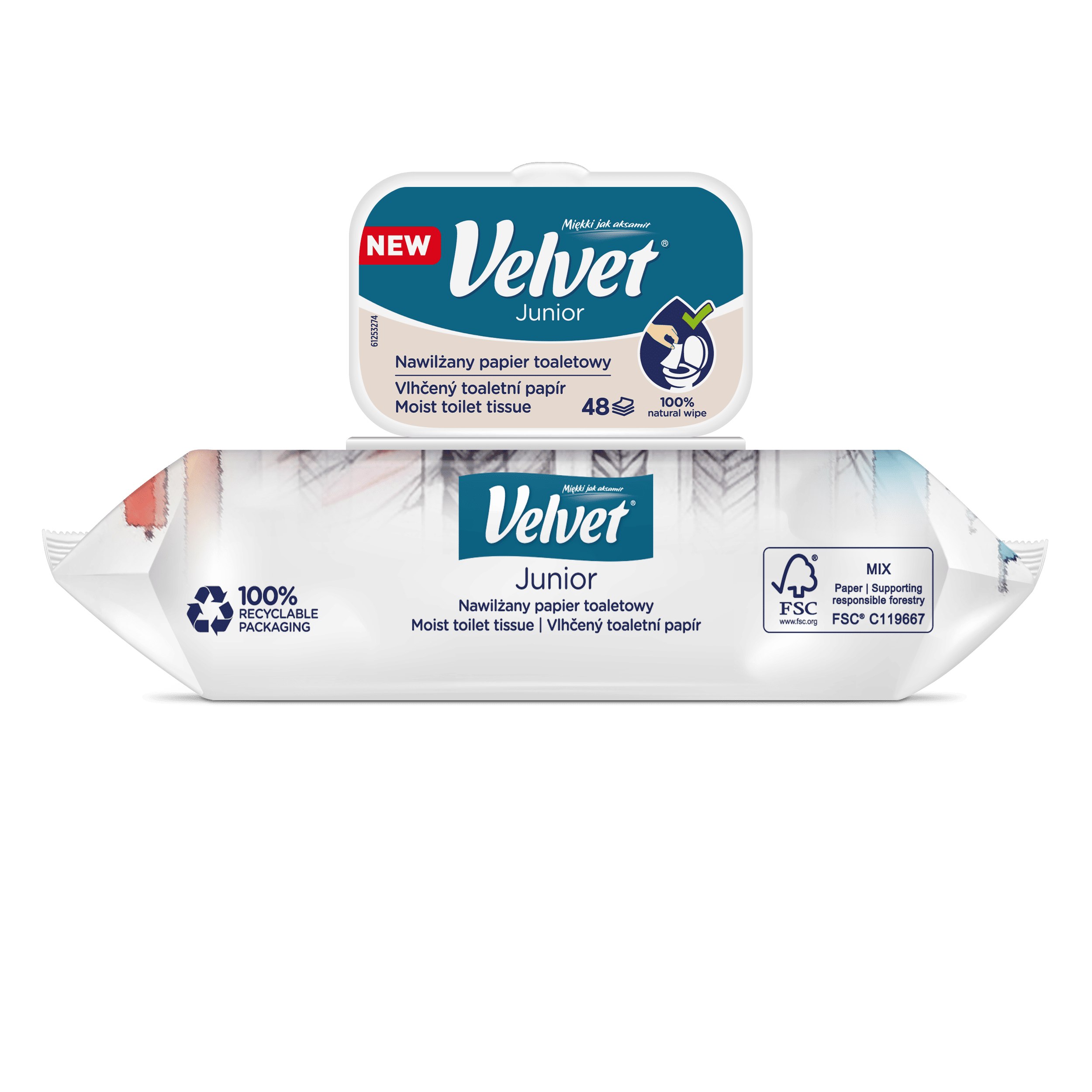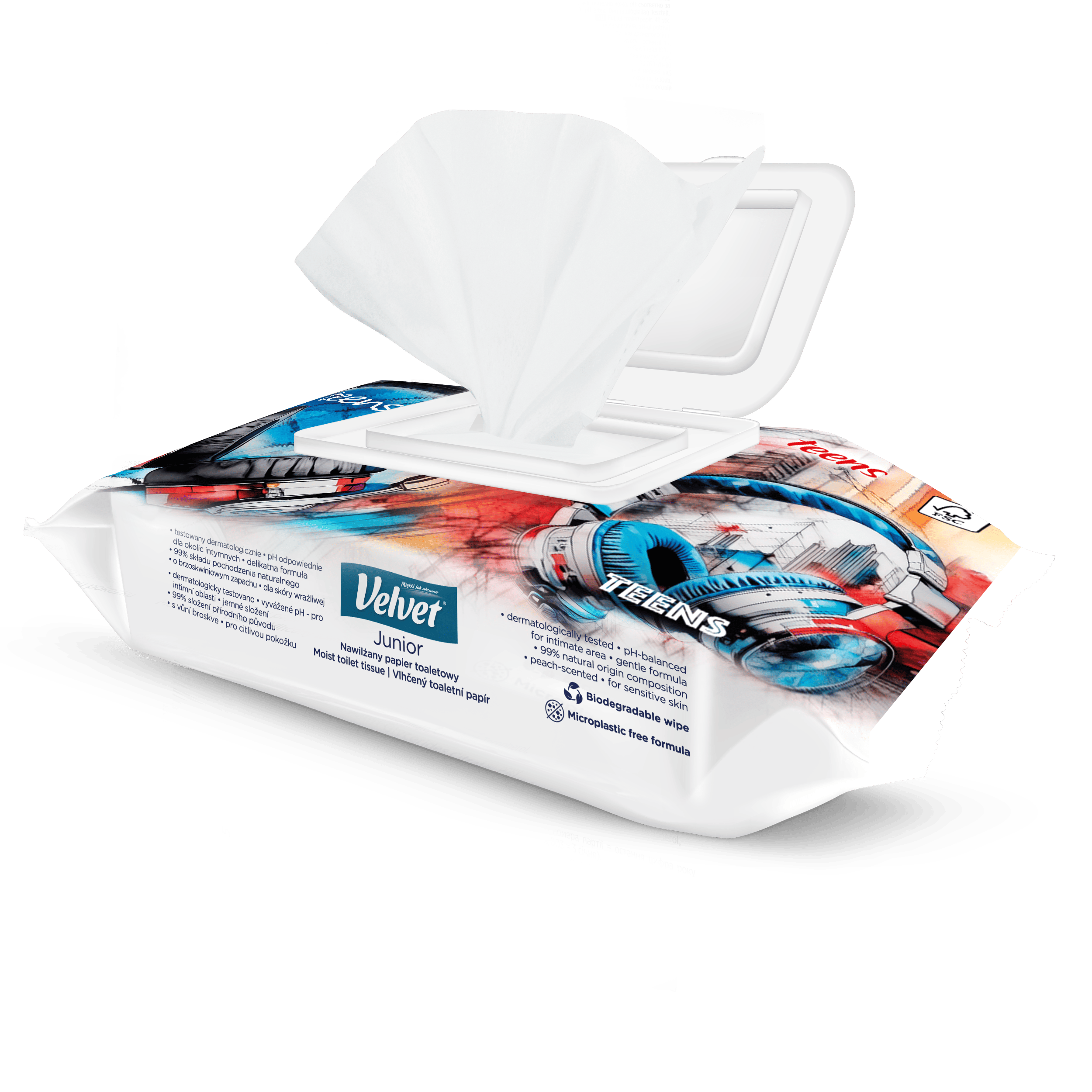 Vlhčený toaletní papír Velvet Junior nabízí kombinaci dvou grafických designů – jeden je určen pro mladší, předškolní děti, které teprve začínají svou cestu k samostatnosti na toaletě, a druhý je navržen s ohledem na starší děti, které si jej rády přibalí do školního batohu a vezmou s sebou. Produkt je dermatologicky testován a má ovocnou vůni.