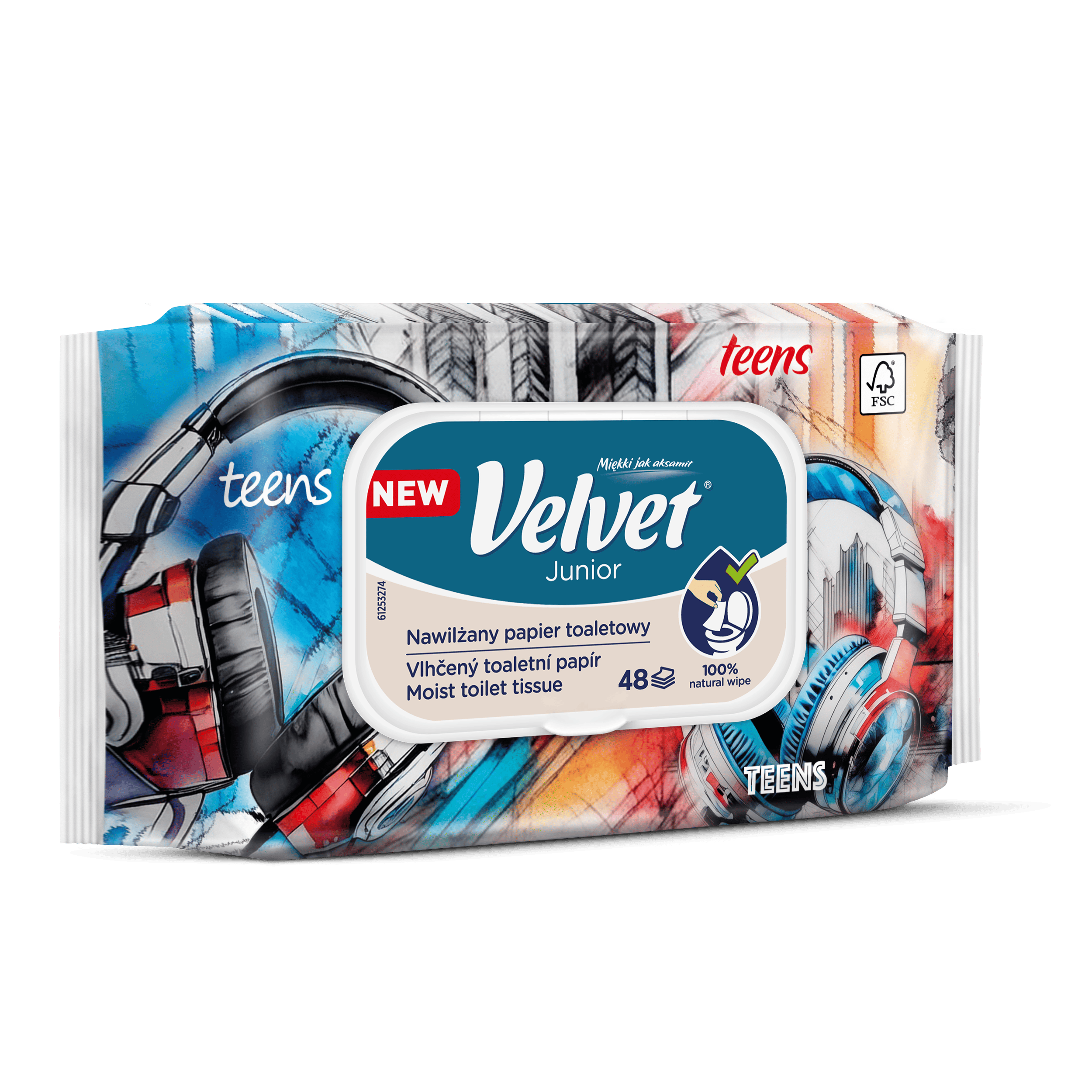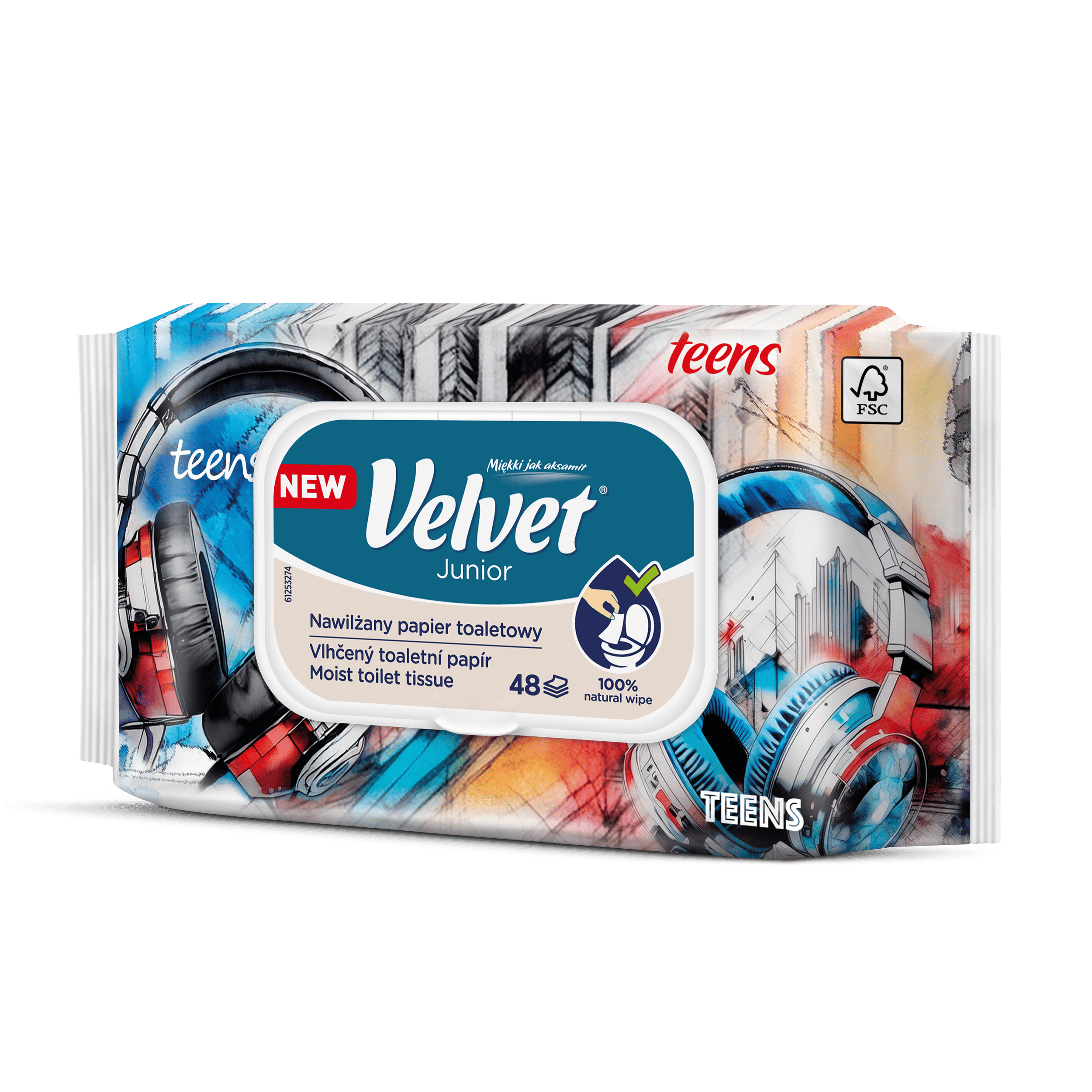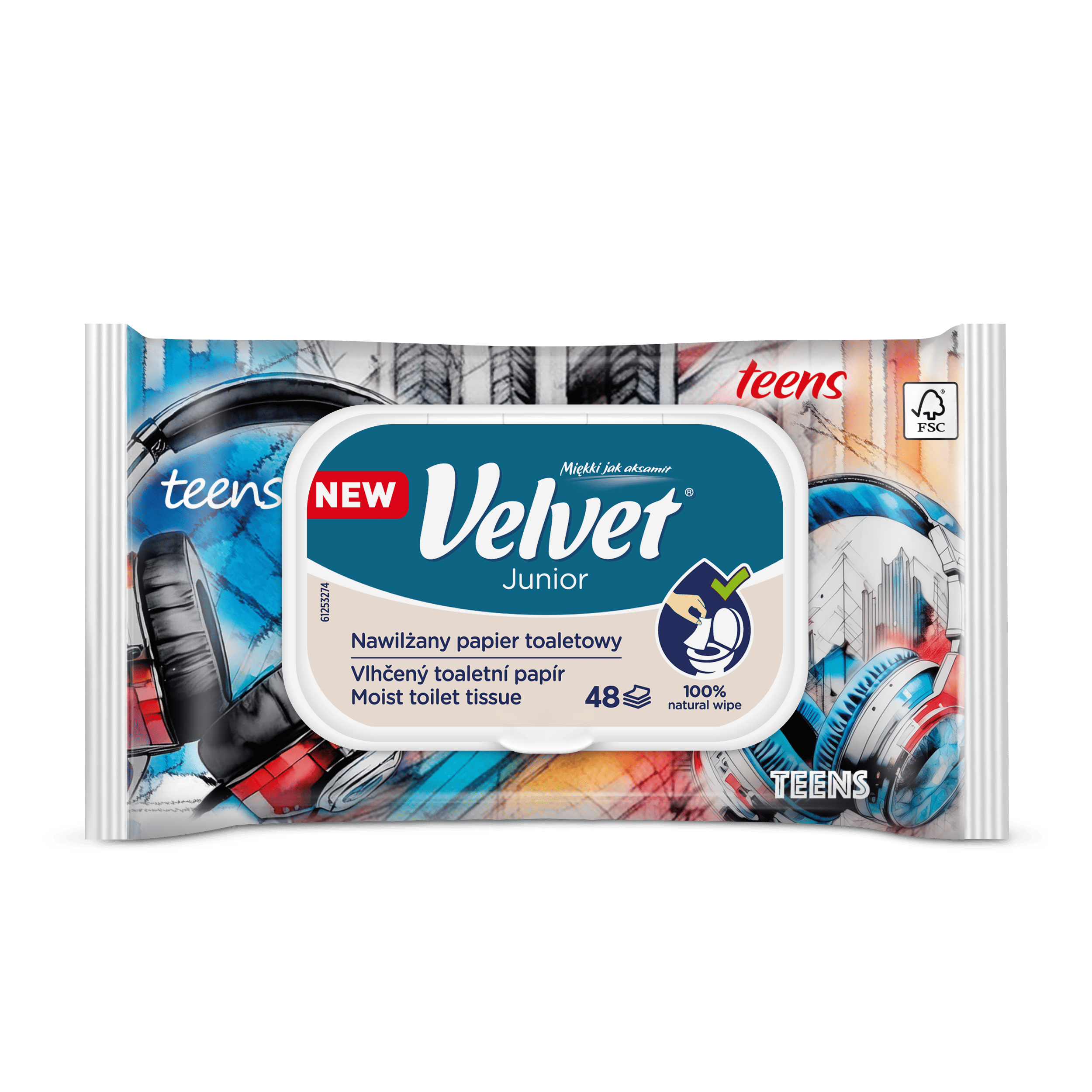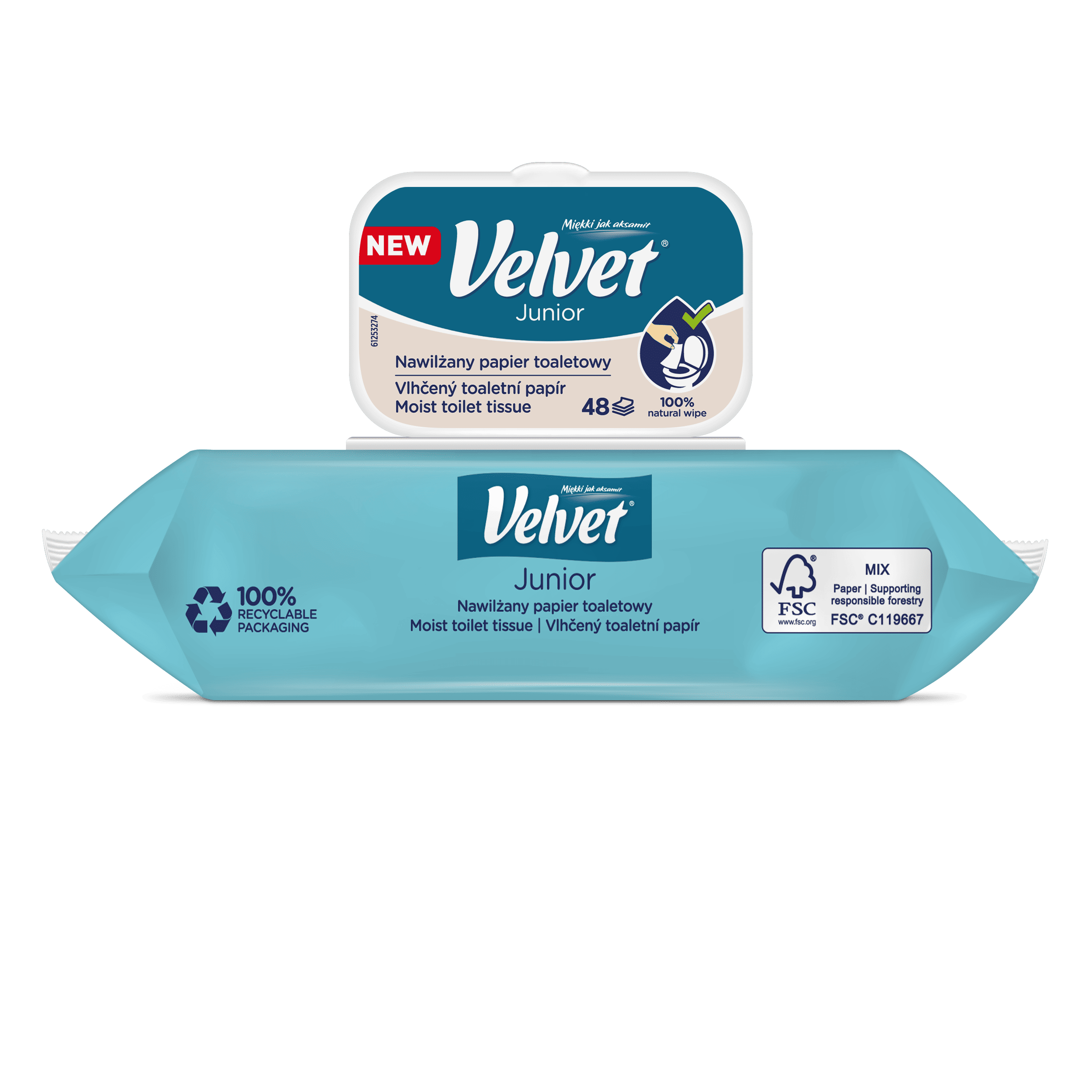 Vlhčený toaletní papír Velvet Junior nabízí kombinaci dvou grafických designů – jeden je určen pro mladší, předškolní děti, které teprve začínají svou cestu k samostatnosti na toaletě, a druhý je navržen s ohledem na starší děti, které si jej rády přibalí do školního batohu a vezmou s sebou. Produkt je dermatologicky testován a má ovocnou vůni.