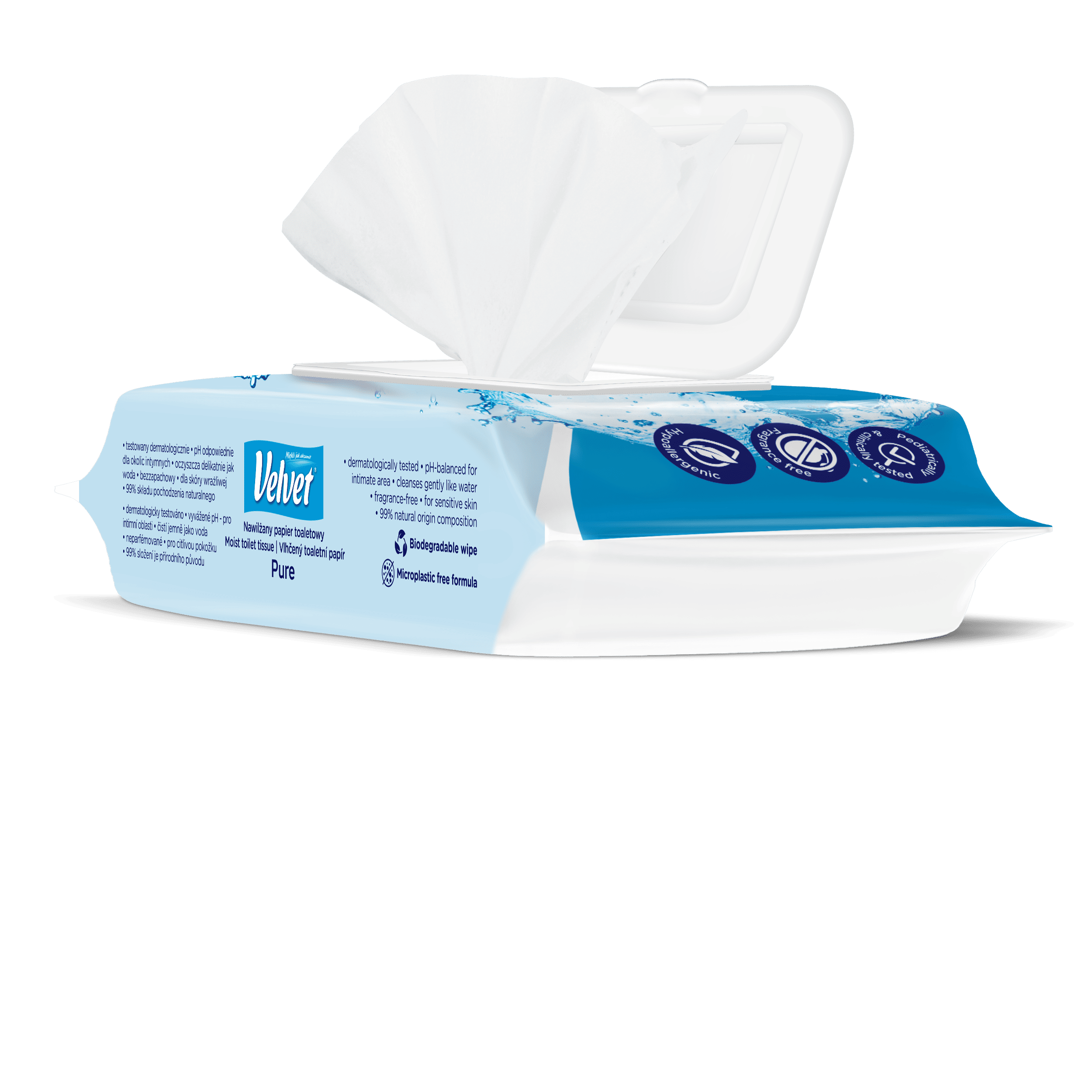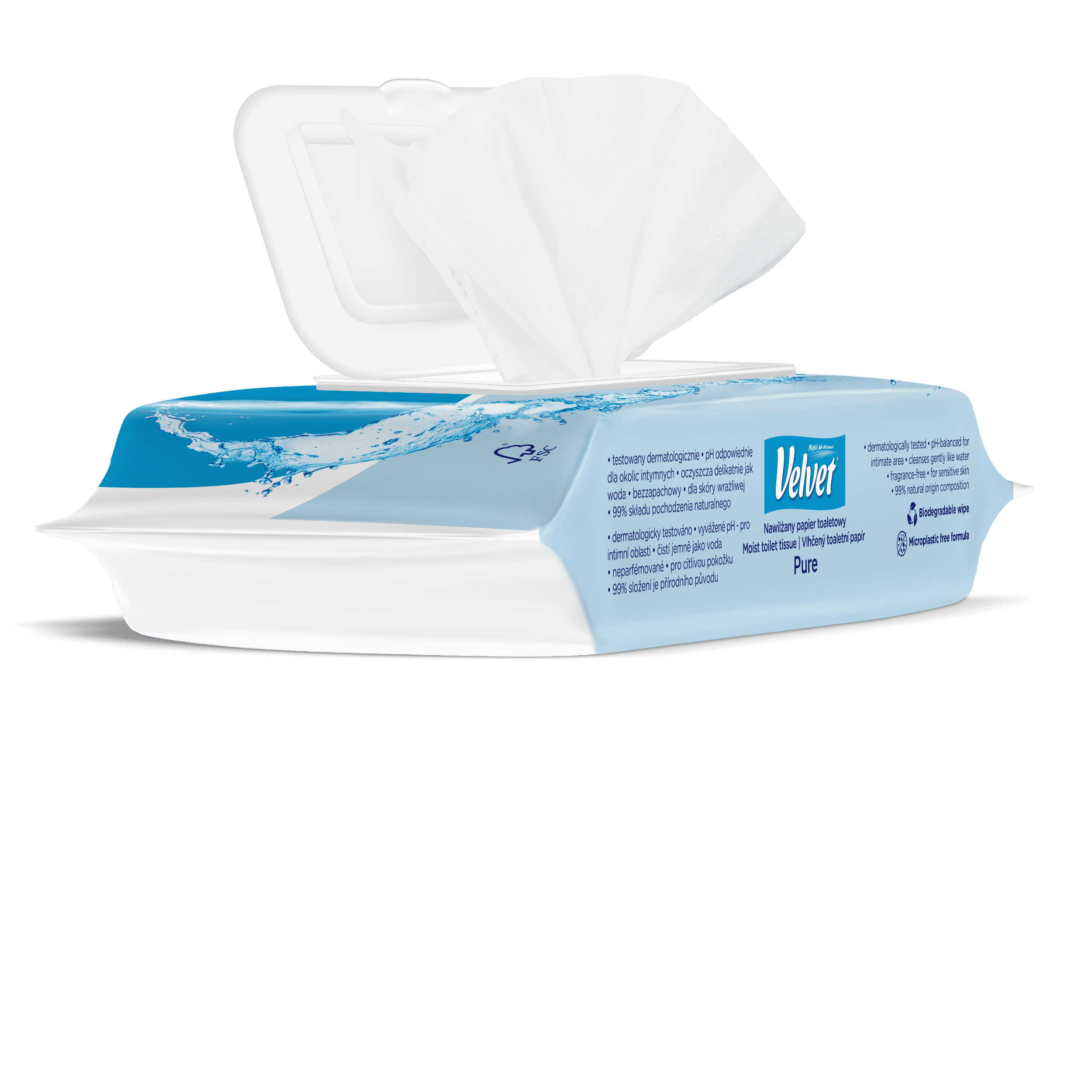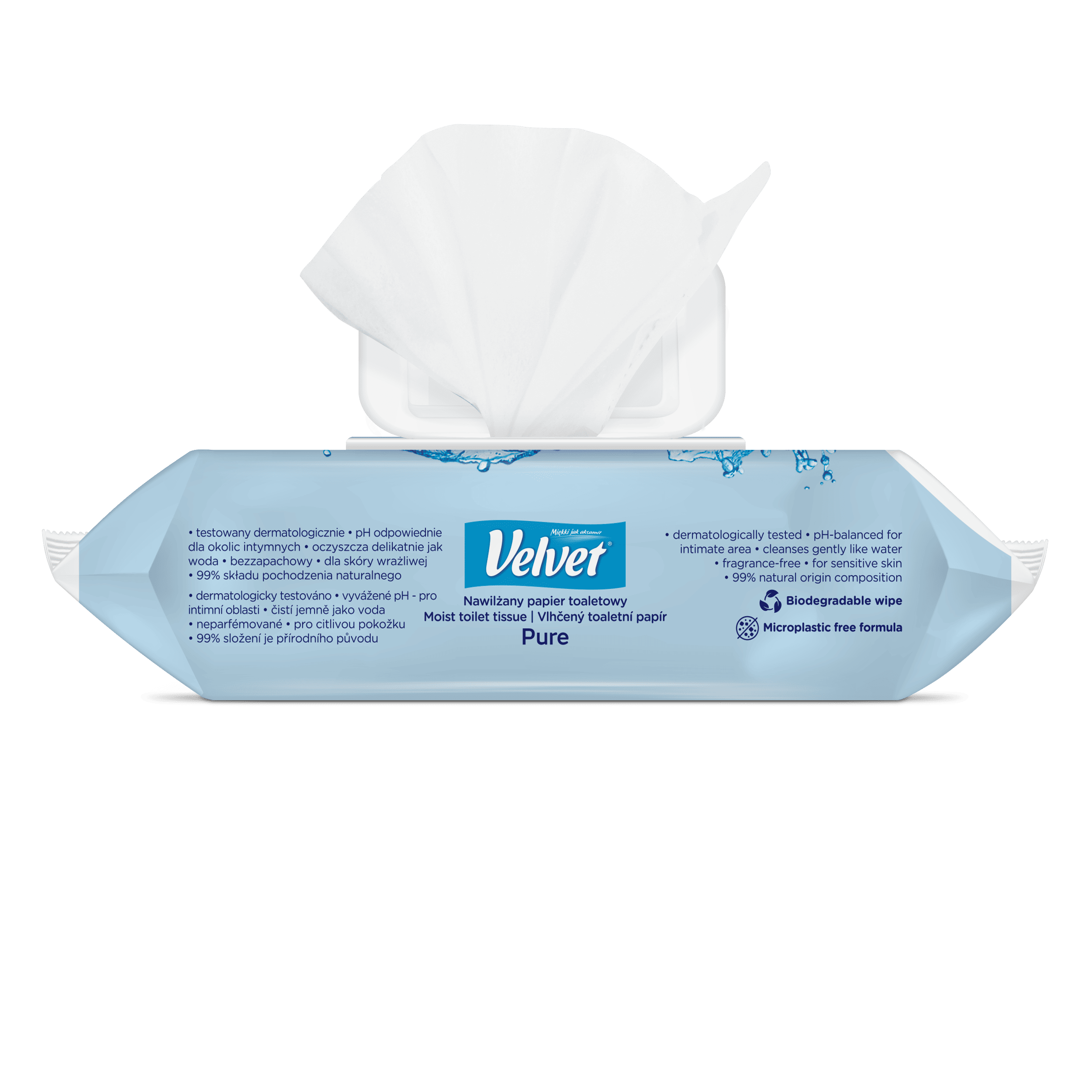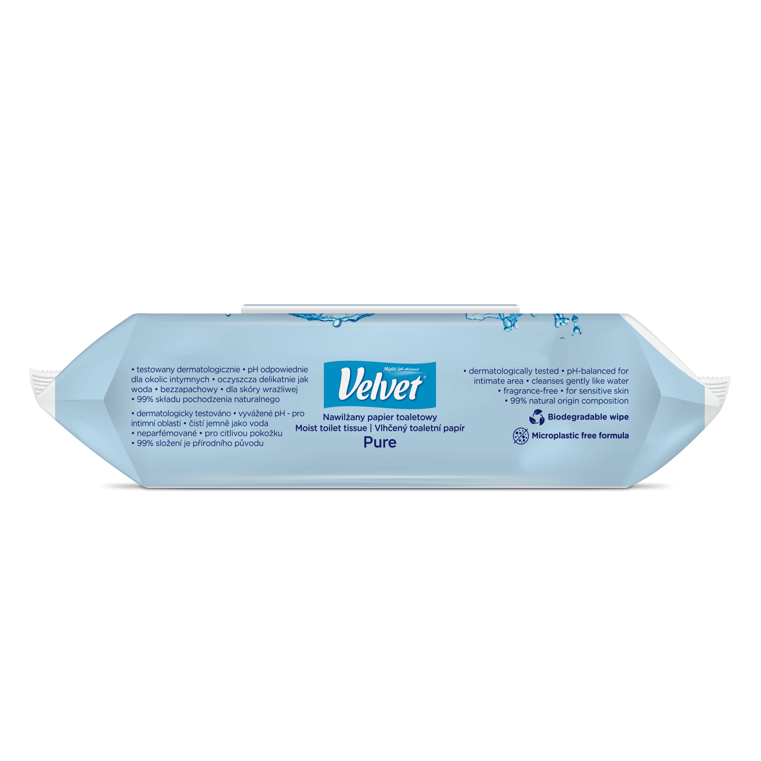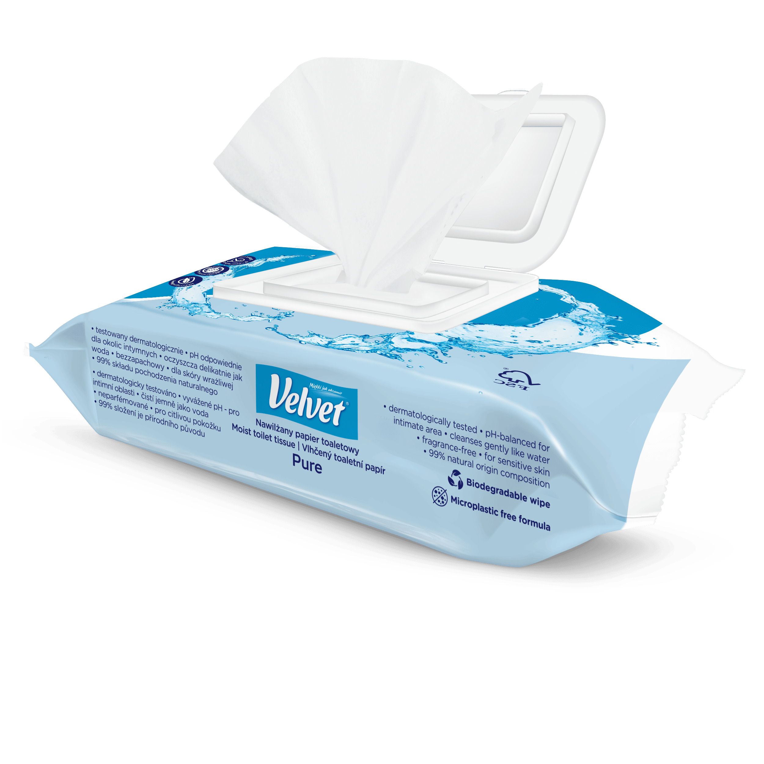 Crystalline purity and gentleness. Fragrance-free, moist toilet paper with a gentle formula that works gently and effectively like water! Simple composition, pH suitable for the intimate area, aloe vera extract and lactic acid ensure daily hygiene and care, creating a feeling of freshness and comfort in any conditions. It can be flushed down the toilet – the wipes are biodegradable, just like ordinary toilet paper. The product has been dermatologically tested.
