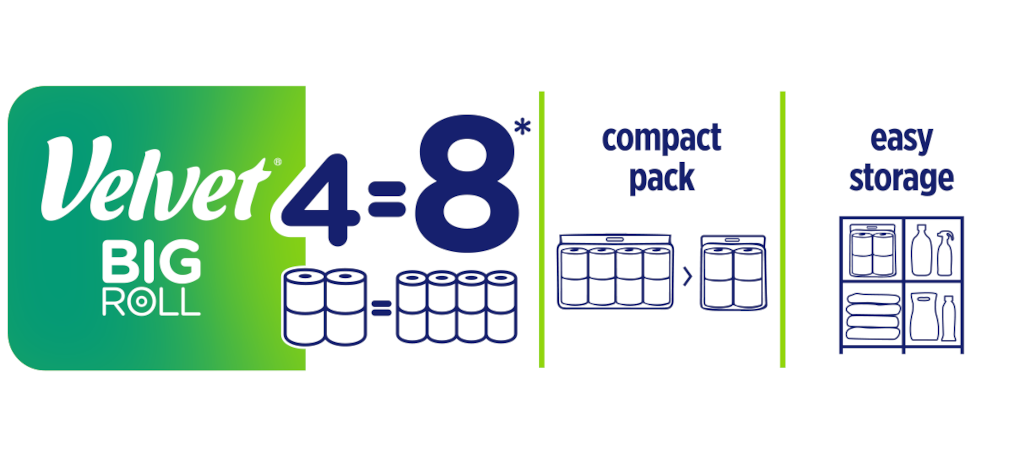 * Długość 4 rolek Velvet BIG ROLL odpowiada długości 8 standardowych rolek papieru Velvet Delikatnie biały. Dane dotyczą porównania papieru Velvet BIG ROLL ze standardowym papierem Velvet Delikatnie biały 8 rolek.