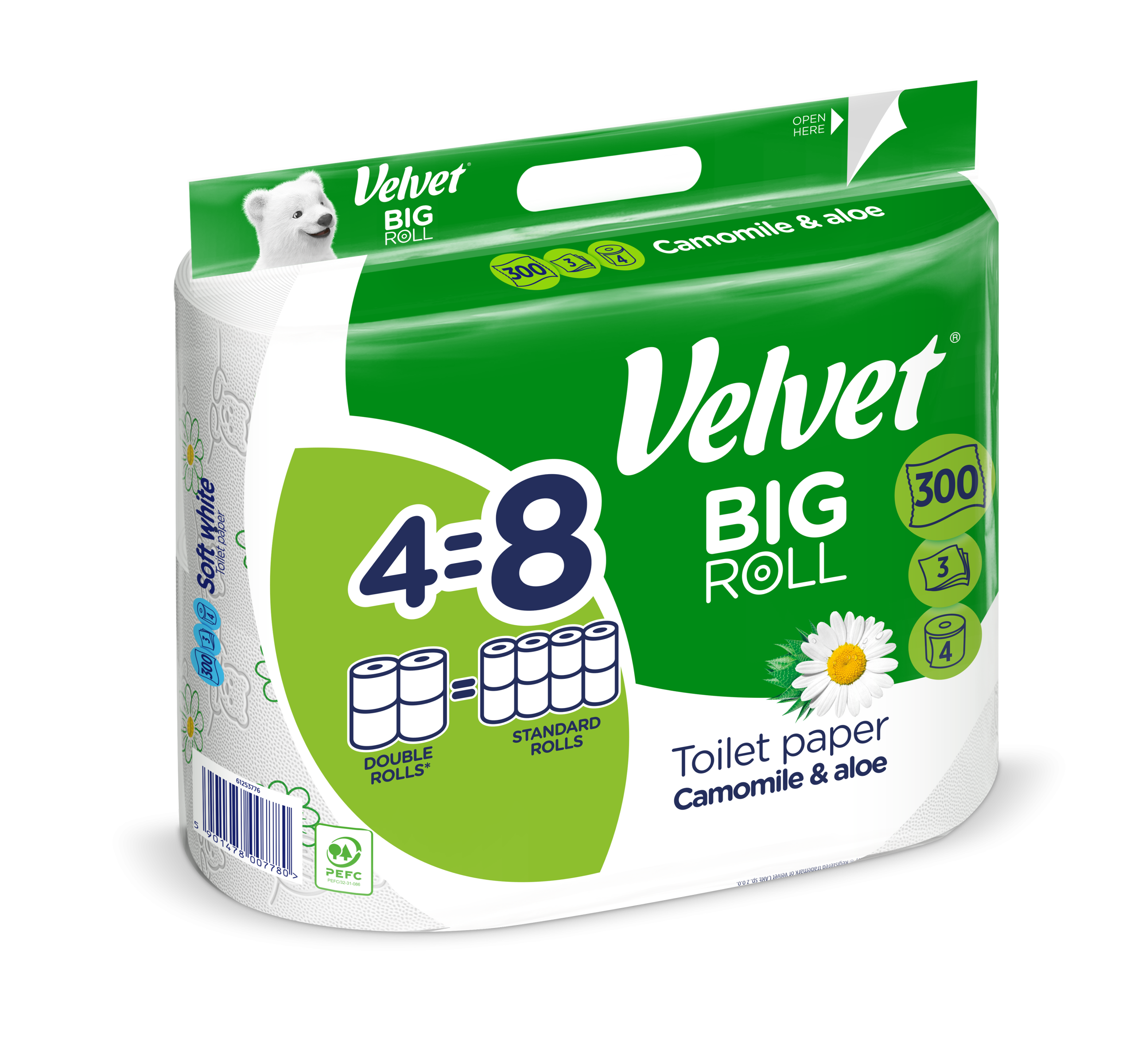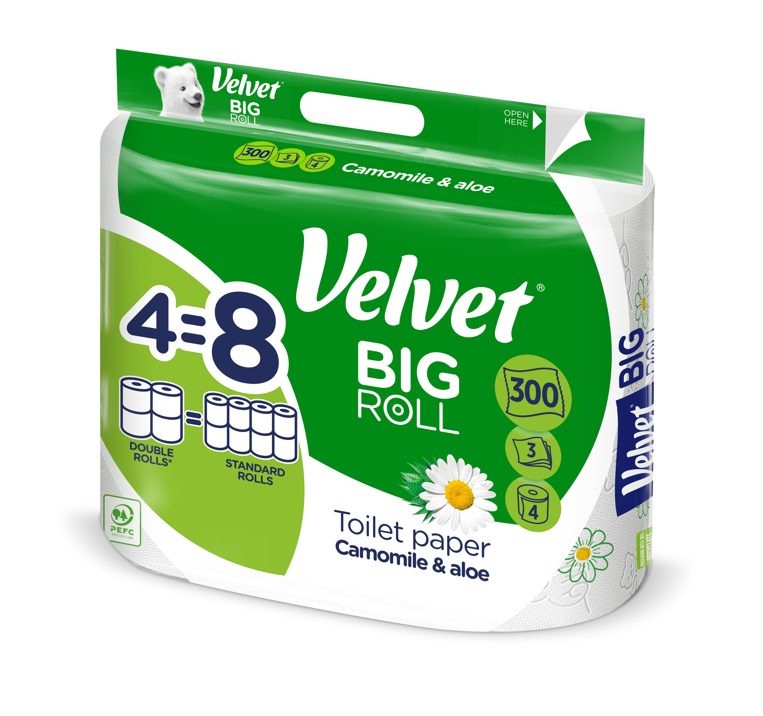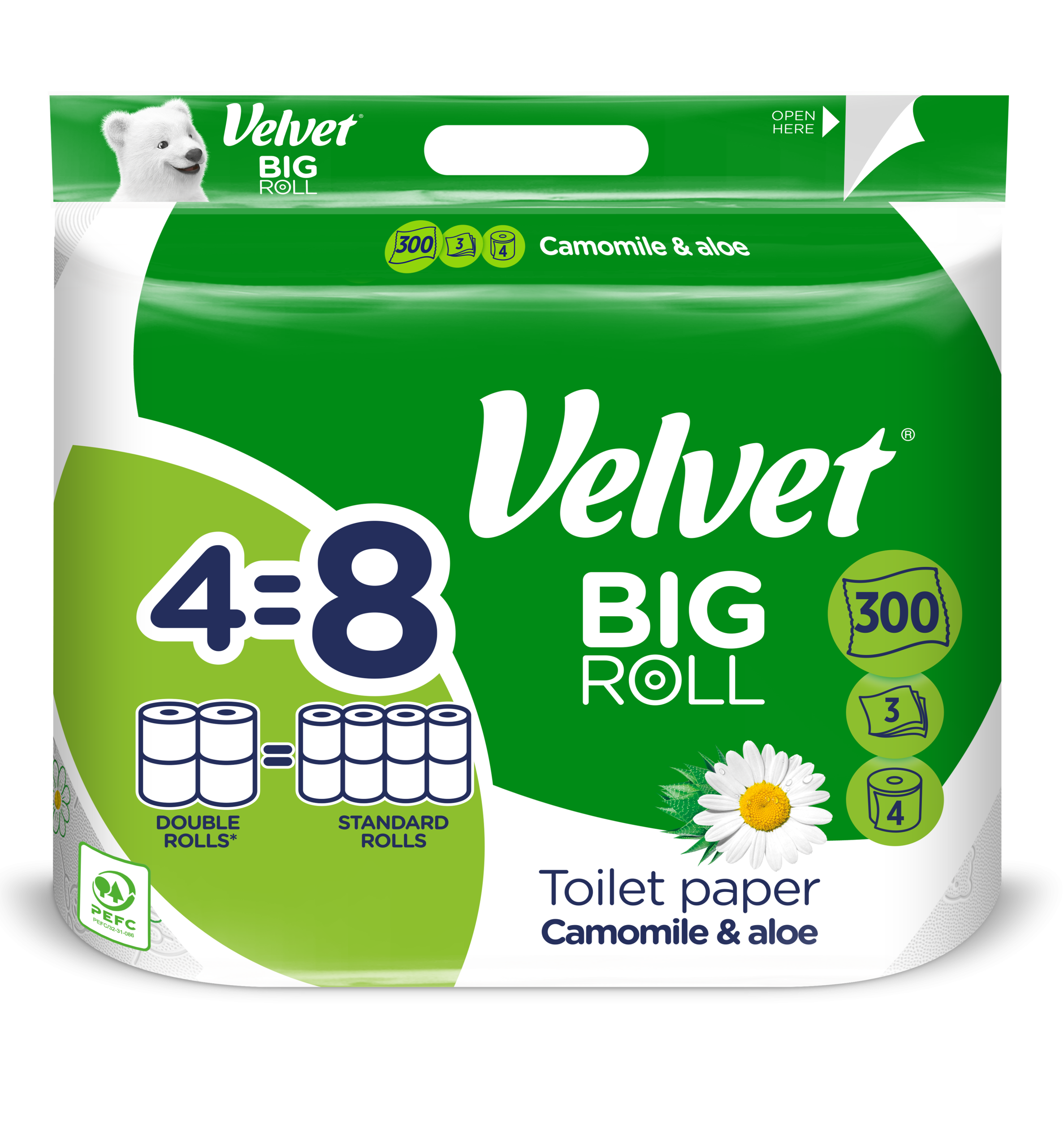 4 rolki Velvet BIG ROLL zastępują 8 standardowych rolek Velvet (150 listków), co oznacza rzadszą wymianę, wygodę na co dzień oraz więcej miejsca w łazience. Velvet BIG ROLL Rumianek i Aloes – 300 listków, 3 warstwy, 4 rolki — to praktyczne, kompaktowe i wyjątkowo wydajne rozwiązanie, które łączy delikatność, funkcjonalność i dłuższe użytkowanie, zapewniając codzienny komfort Tobie i Twoim bliskim.