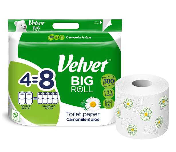 Papier toaletowy Velvet Rumianek i Aloes BIG ROLL to wyjątkowo wydajna rolka zawierająca 300 listków miękkiej, 3‑warstwowej bibułki, ozdobionej subtelnym, tłoczonym wzorem w misie, nadrukiem uroczych rumianków i wzbogaconej łagodnym, rumiankowym zapachem, który wprowadza do łazienki świeżość i poczucie komfortu. Delikatna formuła z dodatkiem rumianku i aloesu sprawia, że produkt jest przyjemny w codziennym użytkowaniu i idealnie dopasowany do potrzeb całej rodziny.