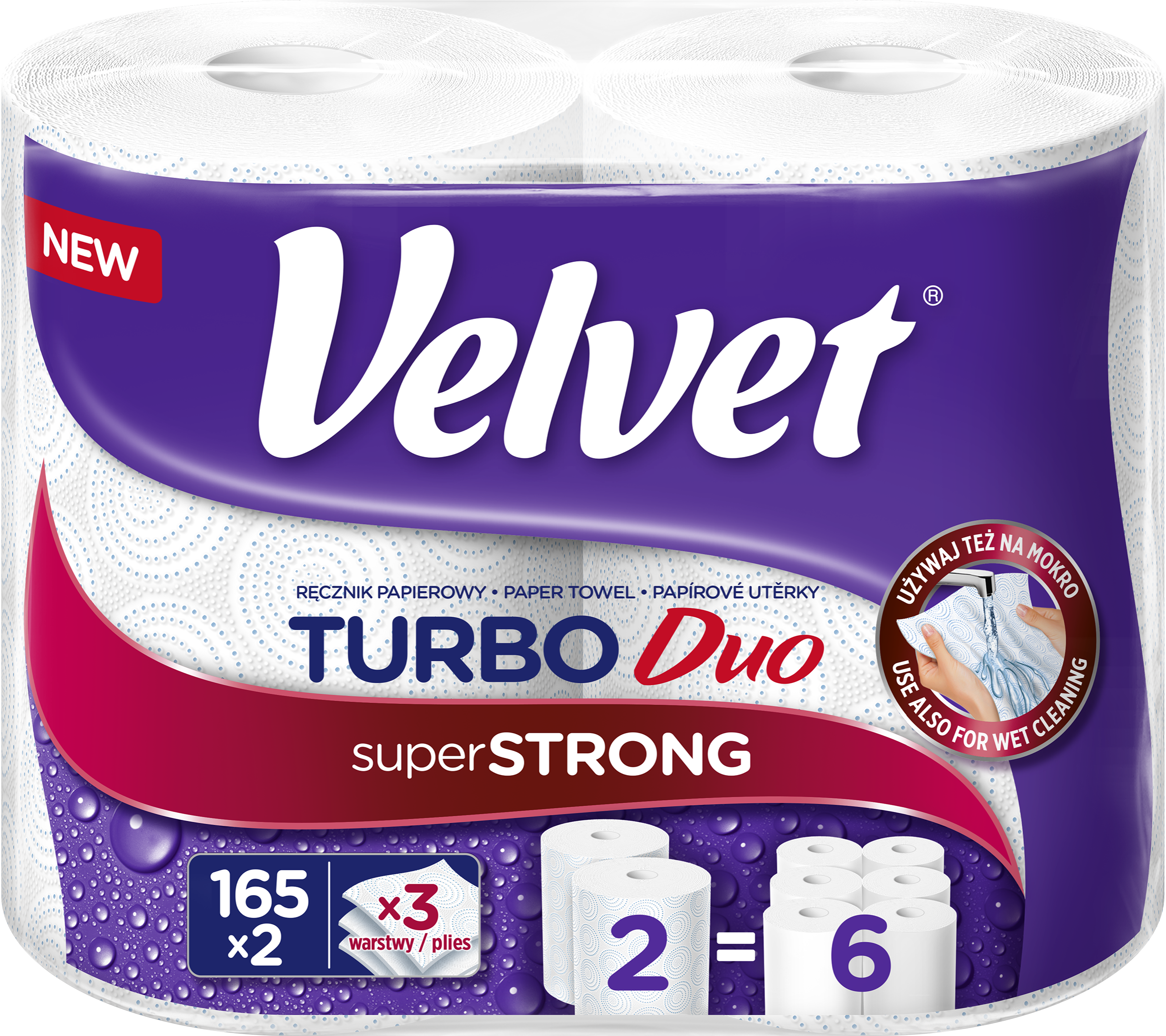 Ręcznik papierowy Velvet Turbo Duo to wyjątkowy, mocny i chłonny ręcznik o jakości premium, tak jak ręcznik Velvet Turbo. Dzięki 3 warstwom wytrzymałej bibułki nie rozrywa się, nie zostawia pyłków i może być używany do wszelkich prac domowych — zarówno na sucho, jak i na mokro.