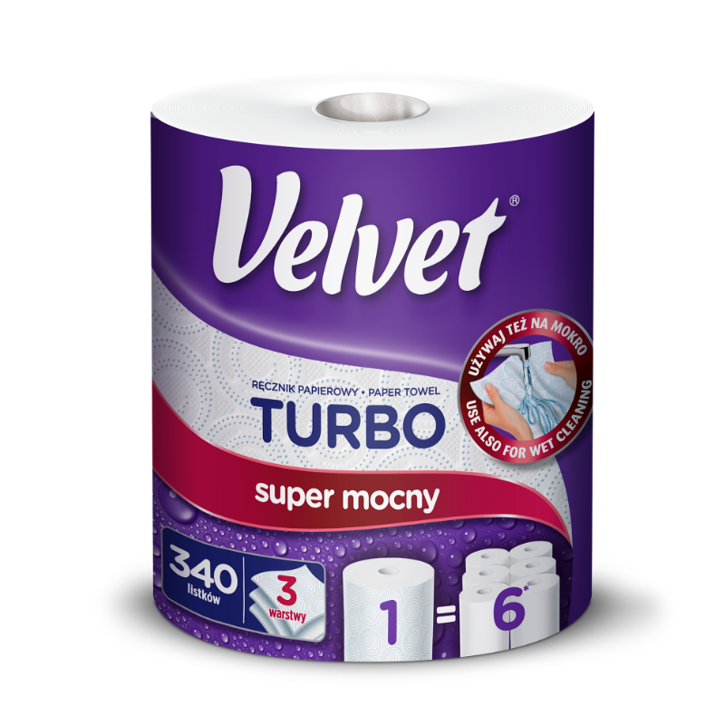 Nie każdy bohater nosi pelerynę – czasem to po prostu Velvet Turbo. Niezwykle chłonny, mocny i niezawodny ręcznik papierowy, który szybko i skutecznie usuwa zabrudzenia i działa równie dobrze na sucho, jak i na mokro. Velvet Turbo – sprzymierzeniec w codziennych porządkach.